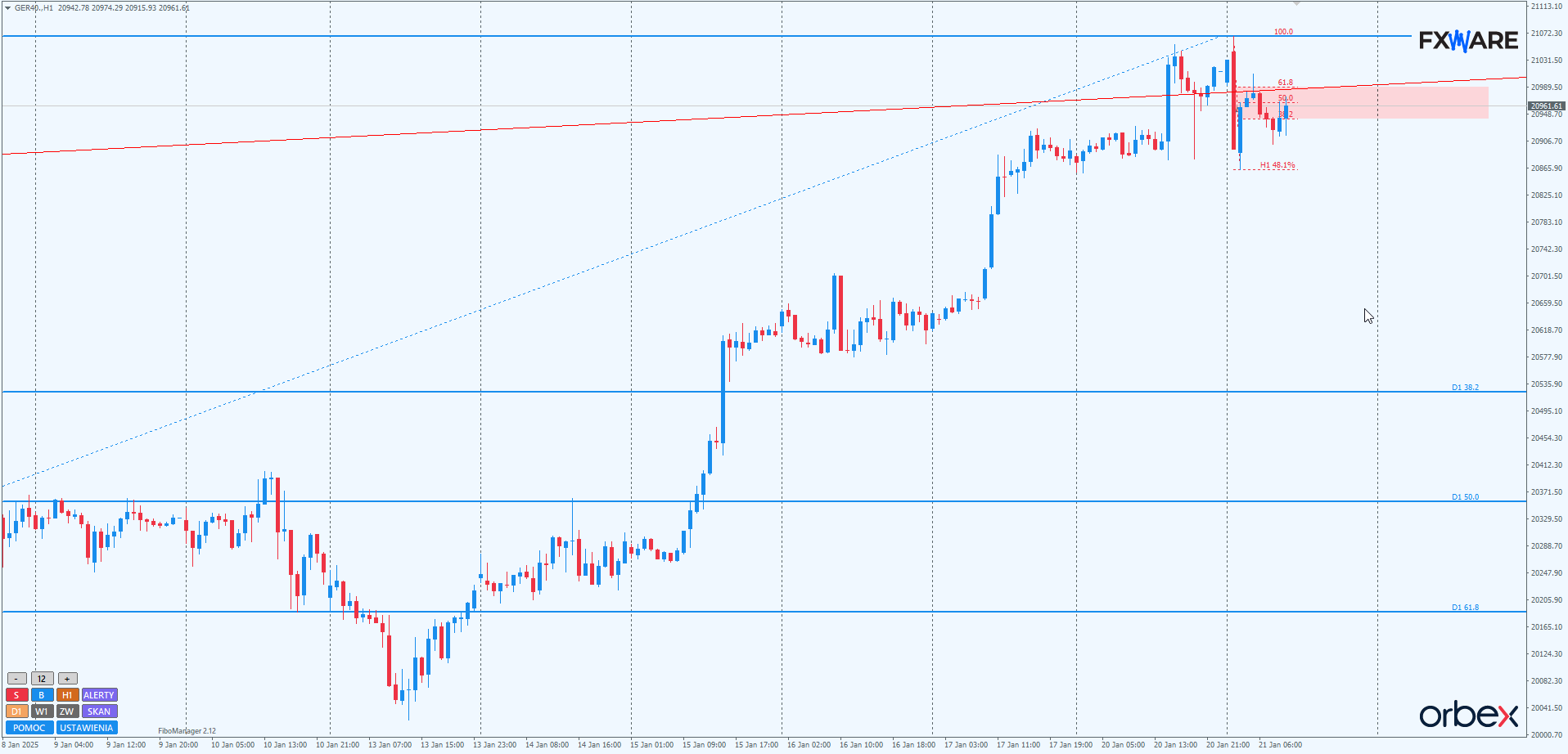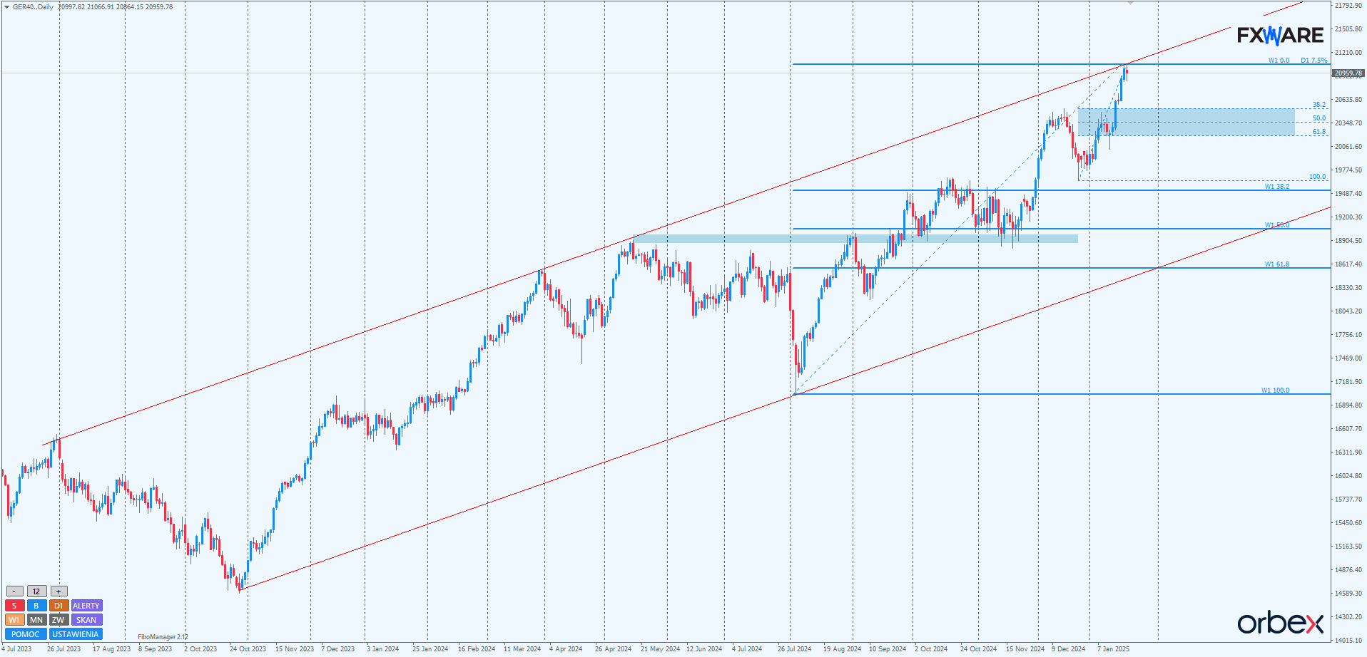 Tym istotniejsze stają się reakcje na LT, poziomy RN (z których 21000 na razie powstrzymał wzrosty) oraz obraz momentum. Jeśli górne ograniczenie kanału wzrostowego miałoby powstrzymać dalsze wzrosty, pierwszym naturalnym celem korekty będą grudniowe szczyty, które aktualnie pokrywają się z poziomem Fibo 38,2 całego tegorocznego swingu wzrostowego.