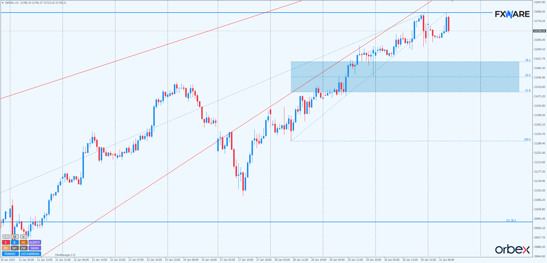 DAX od początku roku znajduje się w przyspieszonym impulsie długoterminowego trendu wzrostowego. Spadkowe sesje w styczniu można policzyć na palcach jednej ręki. Praktycznie codziennie ustanawiane jest nowe ATH – tak silnego popytu na spółki indeksu nie było od miesięcy. W aktualnej sytuacji jedynymi kandydatami na miejsca, gdzie mogłaby się rozpocząć jakaś widoczna korekta, są kolejne poziomy round number. Aktualnie nawet spadki w rejony 20500 nie zagroziłyby temu imponującemu trendowi wzrostowemu.