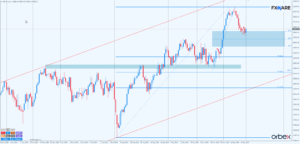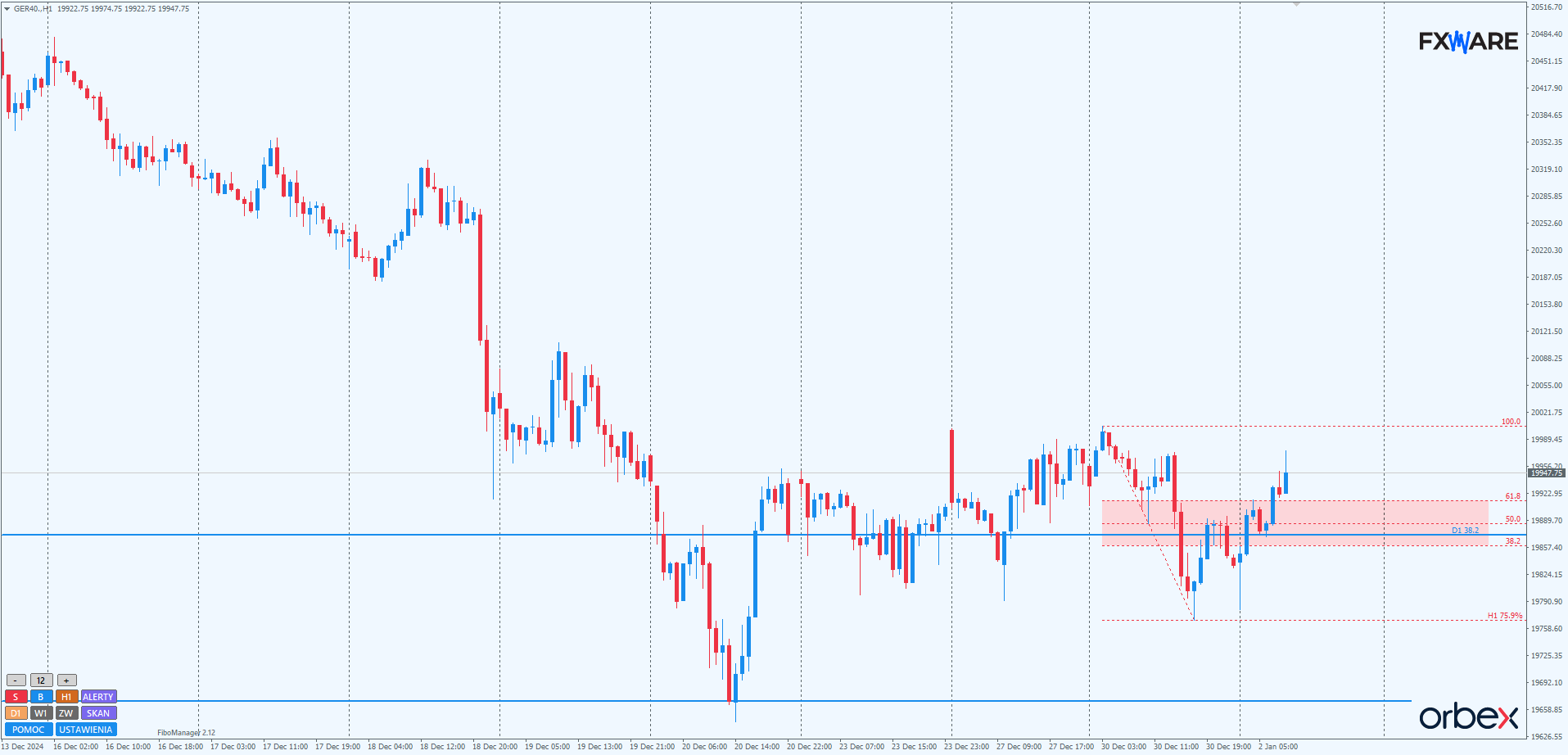 Niemiecki DAX rozpoczyna nowy rok bez luki, od próby sforsowania poziomu Fibo 38,2 swingu wzrostowego rozpoczętego jeszcze pod koniec listopada. Spadki od połowy grudnia w stronę strefy Fibo 38,2–61,8 były na mniejszym momentum niż wzrosty do ATH, a 20 grudnia wyrysowany został prowzrostowy pinbar. Powstrzymuje to chwilowo niedźwiedzie przed głębszym skorygowaniem wzrostów z pierwszej połowy grudnia.