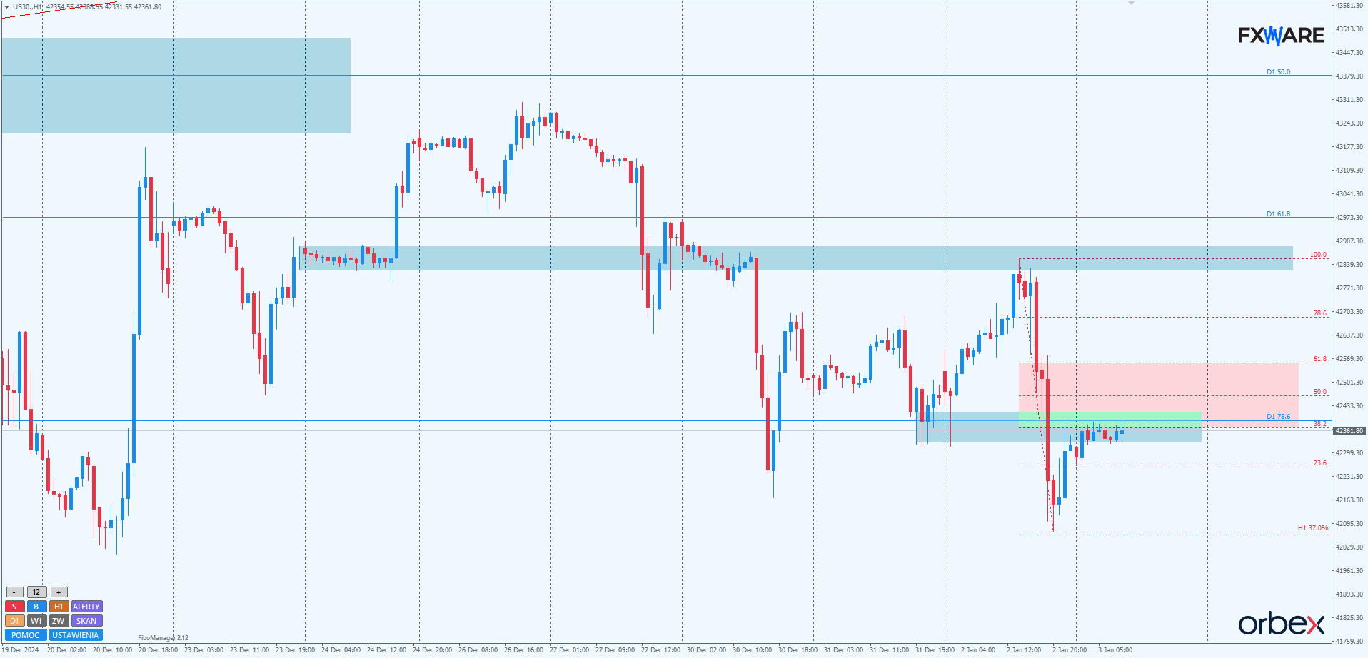 Na wykresie H1 aktualnie odbywa się korekta swingu spadkowego mierzonego od wczorajszych szczytów. Sam swing został zapoczątkowany w strefie wcześniejszych konsolidacji. Po dotarciu do niej na mniejszym momentum reakcja niedźwiedzi była na tyle mocna, że doprowadziła wycenę indeksu do poziomów najniższych od blisko dwóch tygodni.