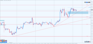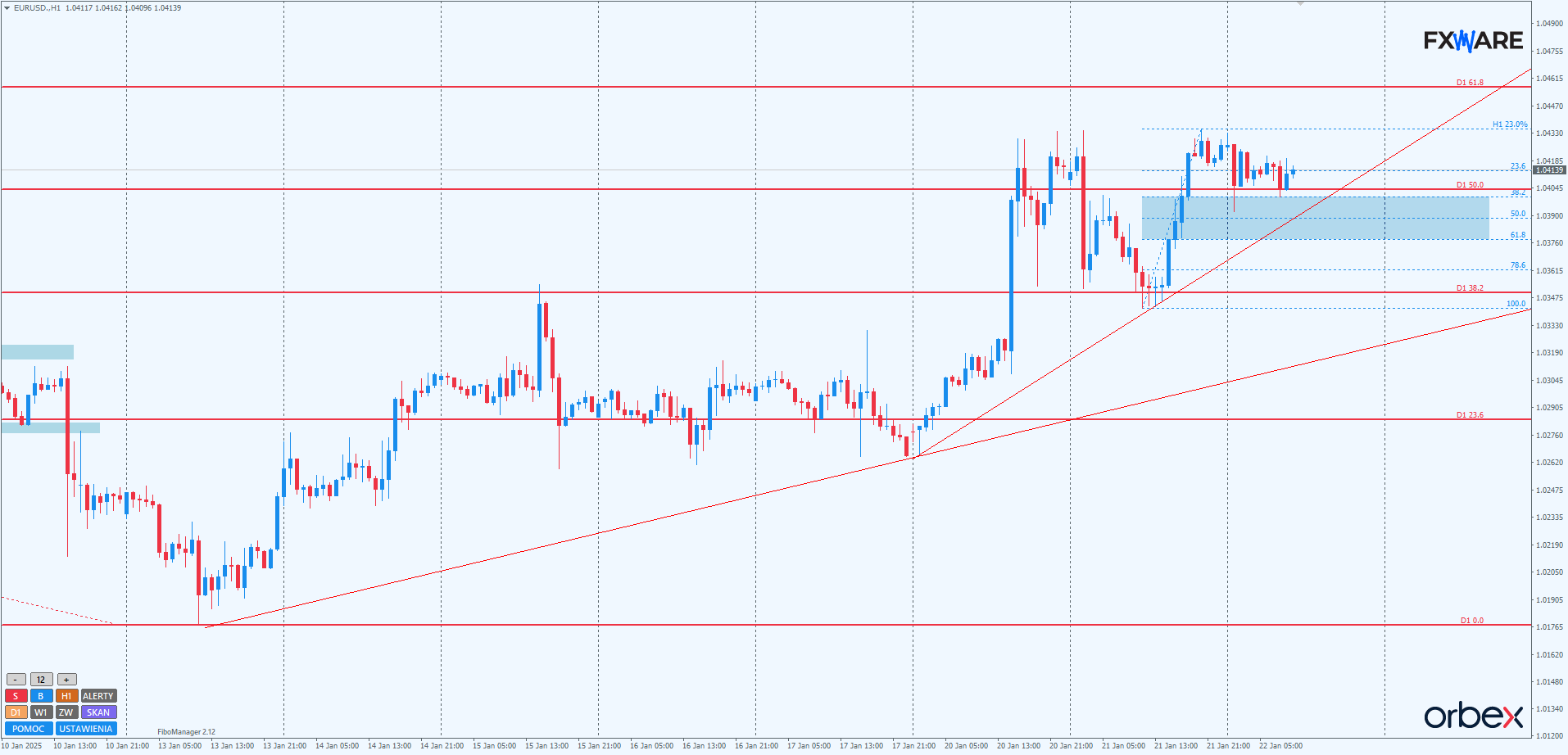 Na wykresie H1 trwa sekwencja wzrostowa po opuszczeniu górą kilkusesyjnej strefy konsolidacji. Na chwilę obecną nawet w przyspieszonej fazie. Kluczowe dla utrzymania momentum przez byki będzie dziś utrzymanie przyspieszonej wzrostowej linii trendu oraz obrona strefy Fibo swingu wzrostowego zapoczątkowanego wczoraj. Obraz momentum ostatnich dwóch sesji również sprzyja bykom. Dlatego, gdyby nastąpiły spadki poniżej 1.03500, psujące ten sielankowy dla byków obraz, mogłyby one być mocno przyspieszone. Tak zwykle dzieje się, gdy spora część uczestników rynku jest zaskoczona rozwojem sytuacji.