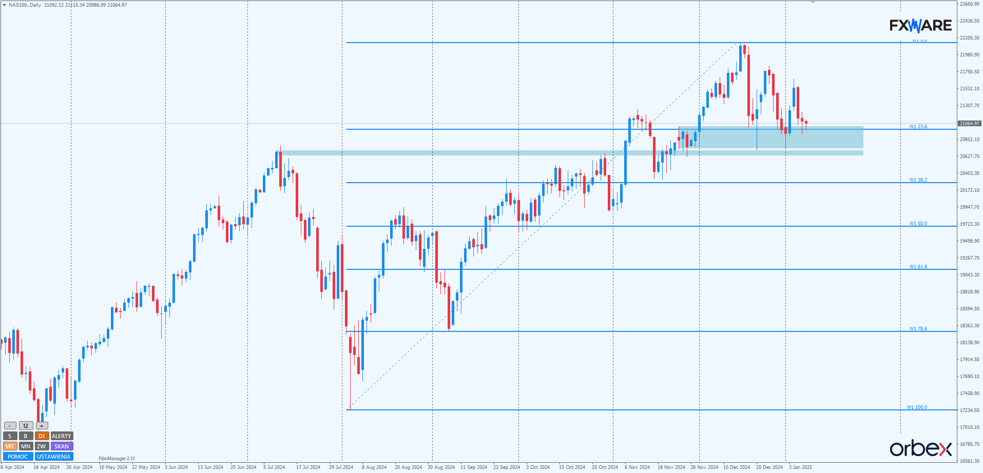 NASDAQ, po skorygowaniu spadków od ATH (korekta zakończona zdrowym pinbarem), w ostatnich dniach 2024 roku spadł do okolic 20 800. W rejonie tym znajduje się wcześniejsza strefa konsolidacji i poziom Fibo 23,6% długoterminowej sekwencji wzrostowej. Ponowne wzrosty od początku roku doczekały się korekty, która również zakończyła się na wspomnianym wyżej poziomie. Cała ta ponad dwutygodniowa “przepychanka” byków i niedźwiedzi sprawiła, że znajdujemy się w rozległej wertykalnie konsolidacji, ograniczonej poziomami 20 700 od dołu i 21 800 od góry. Można się więc spodziewać częstej zmiany momentum w kolejnych swingach byków i niedźwiedzi, do momentu opuszczenia tej konsolidacji.