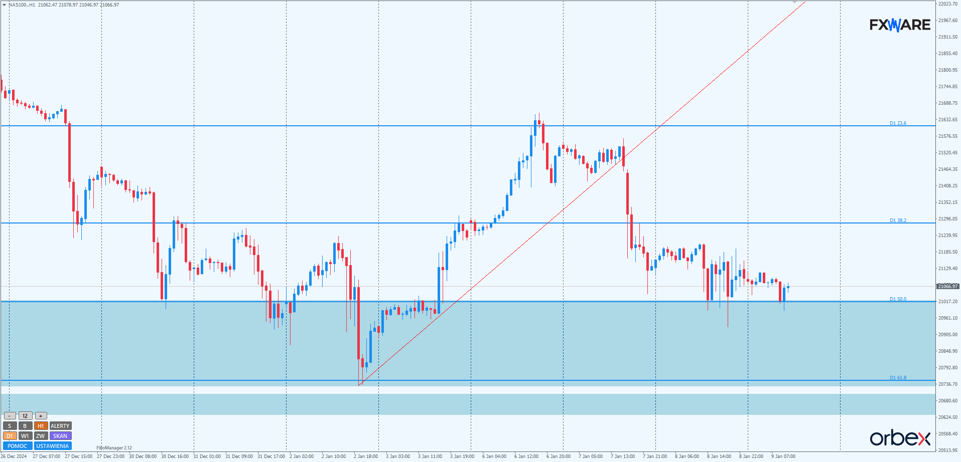 Na wykresie H1 również widoczna jest konsolidacja. Aktualnie cena znajduje się w okolicach jej pivotu. Konsolidacja ta jest ograniczona od dołu strefą wcześniejszej, mniejszej konsolidacji z 3 stycznia, a od góry poziomem 21 200. Jak na razie silniejsze reakcje miały miejsce na dolną bandę (wczoraj i dzisiaj). W przypadku opuszczenia konsolidacji górą, pierwszym celem będzie poziom 21 450, gdzie przedwczoraj wystąpiła luka. Alternatywnie, przebicie od góry wczorajszych minimów może sprowadzić cenę do wspomnianego wyżej poziomu 20 800, i to nawet na sporym momentum, z powodu braku głębszych korekt spadków od 6 stycznia.