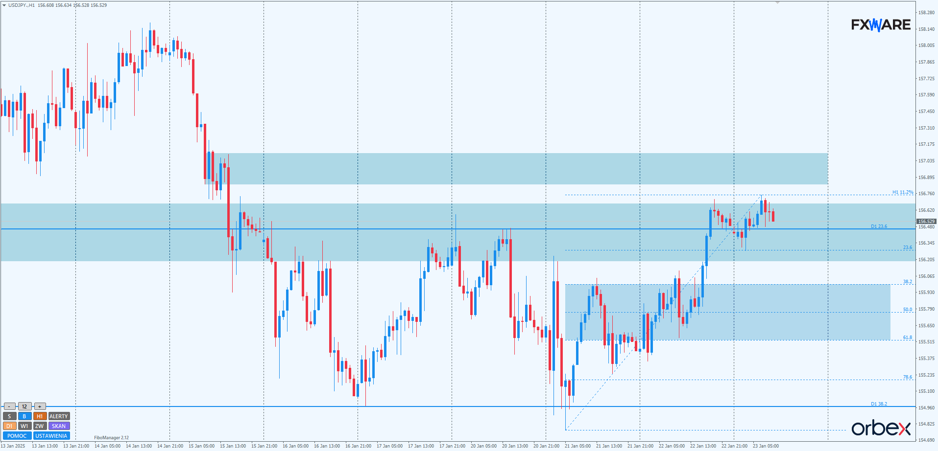 Na wykresie H1 widać dzisiaj lekkie spowolnienie spowodowane brakiem retestu strefy konsolidacji, z której wczoraj po południu nastąpiło wybicie. Również bliskość poziomów strefy konsolidacji z 15 stycznia działa studząco na byki, gdyż potencjalnie jest to miejsce dogodne dla podaży do ponownego shortowania. Dokładnie tam przebiega też poziom RN 157.000. Dotarcie tam na małym momentum zwiększa szanse na aktywność niedźwiedzi. Podobnie szanse na większą aktywność byków zwiększa dotarcie na małym momentum do górnej bandy strefy konsolidacji ostatnich dwóch dni. Poziom ten przebiega na chwilę obecną w tym samym miejscu, co poziom zniesienia 38,2% dwudniowego lokalnego trendu wzrostowego. Należy mieć jednak na uwadze, że w przypadku dalszych wzrostów cały pomiar będzie się wydłużał, a co za tym idzie, interesująca dla traderów strefa zniesień Fibo będzie się podnosić.