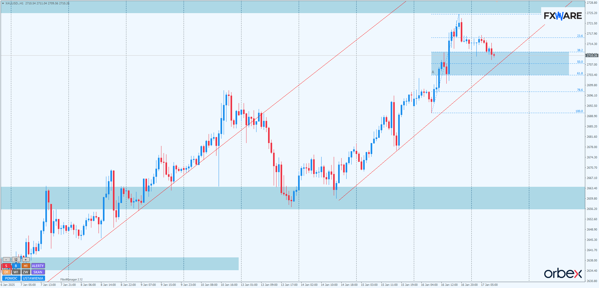 Na wykresie H1 przełom sesji upływa pod znakiem powolnej korekty wczorajszego impulsu wzrostowego. Cena dociera do pivota strefy zniesień Fibo. W tych okolicach znajduje się również przyspieszona linia trendu (LT) oraz RN 2700. Są to solidne przeszkody dla niedźwiedzi, a jednocześnie korzystne miejsca dla byków do ponowienia longów. Jeśli jednak nie zobaczymy tam żadnej reakcji, akcelerowane spadki mogą dosięgnąć 2680 nawet w ciągu dzisiejszej sesji, gdyż jest to miejsce potencjalnego wyłamania struktury 4-sesyjnego trendu wzrostowego.