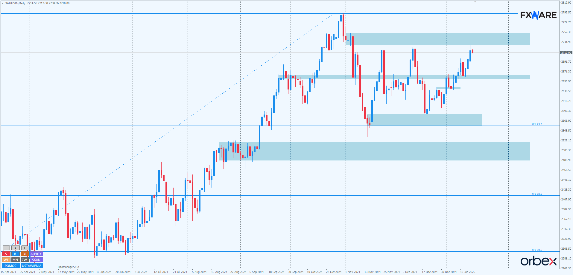 Złoto na D1 zamknęło się powyżej RN 2700. Tym samym dotarło w rejony, które zarówno w grudniu, jak i w listopadzie powodowały mocną aktywność podaży i indukowały impulsowe tąpnięcia.