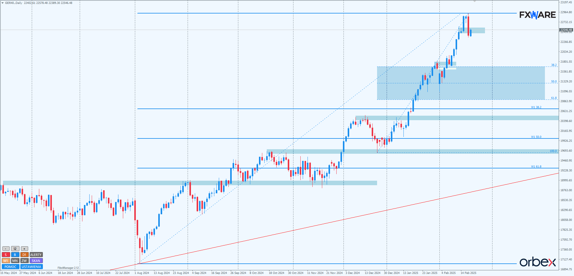 Na wykresie D1 DAX dawno nie widziano tak solidnej świecy spadkowej. Wczorajsze tąpnięcie przekroczyło sumarycznie 500 pipów i tym samym było największym jednodniowym ruchem od 7 miesięcy. Forma zamknięcia wczorajszej świecy daily, zbliżona do marubozu, z minimalnymi knotami, na pewno wywoła trochę refleksji u rozpędzonych i ustanawiających codziennie nowe ATH byków. Kształt świec dziennych w najbliższych 2–3 sesjach dostarczy nam informacji o momentum reakcji byków. Jeśli w ciągu 2-3 sesji nie ustanowią nowego ATH, może to być poważna zachęta dla niedźwiedzi do wyrysowania kolejnego impulsu spadkowego, którego celem tym razem mogą być okolice nawet 21 800.