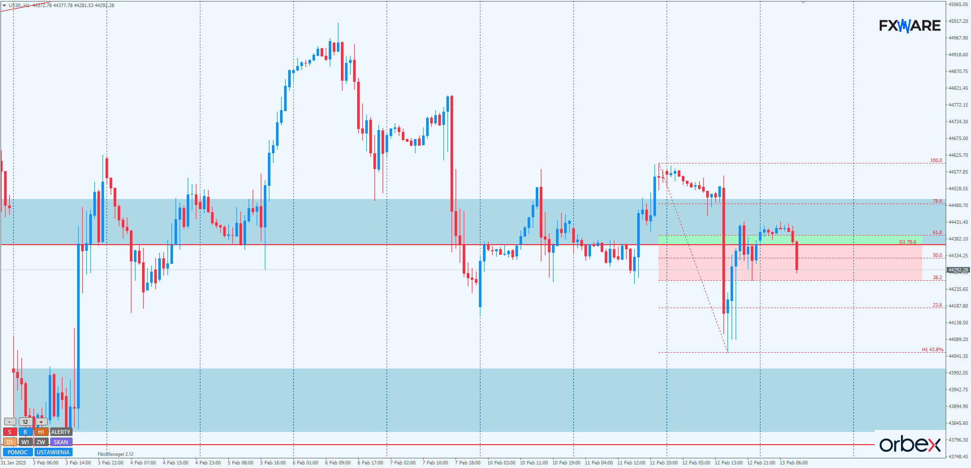 Dow Jones na wykresie dziennym indeks wciąż pozostaje w rozległej wertykalnie strefie konsolidacji. Jej górna banda to okolice ATH, natomiast dolna znajduje się w rejonie 43 900. Jedynymi wskazówkami z punktu widzenia price action są dotychczasowe reakcje popytu, który aktywizuje się, gdy tylko cena wejdzie w niższe rejony obszaru wyznaczonego przez lukę cenową z 3 stycznia. Jednym z takich sygnałów może być wczorajszy pinbar. Gdyby obszar jego knota się obronił, a zamknięcie nastąpiło powyżej poziomu 44 600, można by z dużą dozą prawdopodobieństwa założyć kolejny atak na nowe ATH i być może ponowny retest wybitej i raz już testowanej linii trendu. W przypadku braku reakcji popytu w obszarze knota wspomnianego pinbara cena mogłaby szybko zanurkować nawet do poziomu 43 100.