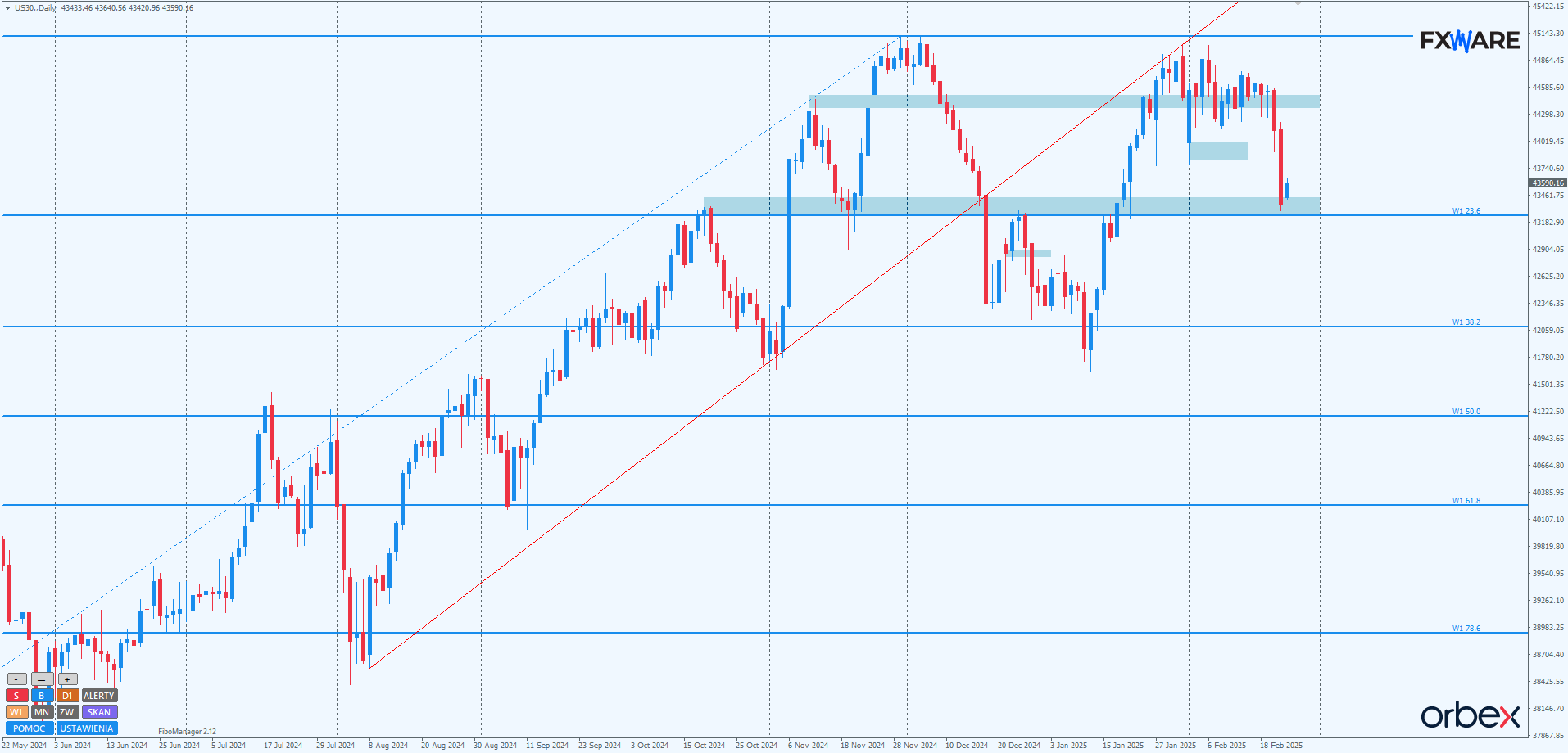 DJ pod koniec zeszłego tygodnia gwałtownie opuścił strefę konsolidacji trwającą blisko miesiąc. Zakres oscylacji ceny wewnątrz zmniejszał się, więc przesilenie było kwestią czasu – zagadką pozostawał natomiast kierunek wybicia. Po piątkowym zamknięciu w formie solidnej świecy spadkowej nie ma już co do tego wątpliwości. Cena dotarła do RN 43 300. Jest to istotny poziom, który wcześniej powodował obustronne reakcje, wyłamania struktur, a także przyspieszenia po retestach. Nie będzie więc niczym niezwykłym, jeśli i tym razem zapoczątkuje korektę zeszłotygodniowego tapnięcia. W zależności od momentum, jakie ukształtuje się dzisiaj, mogłaby ona sięgnąć psychologicznego poziomu 44 000.
