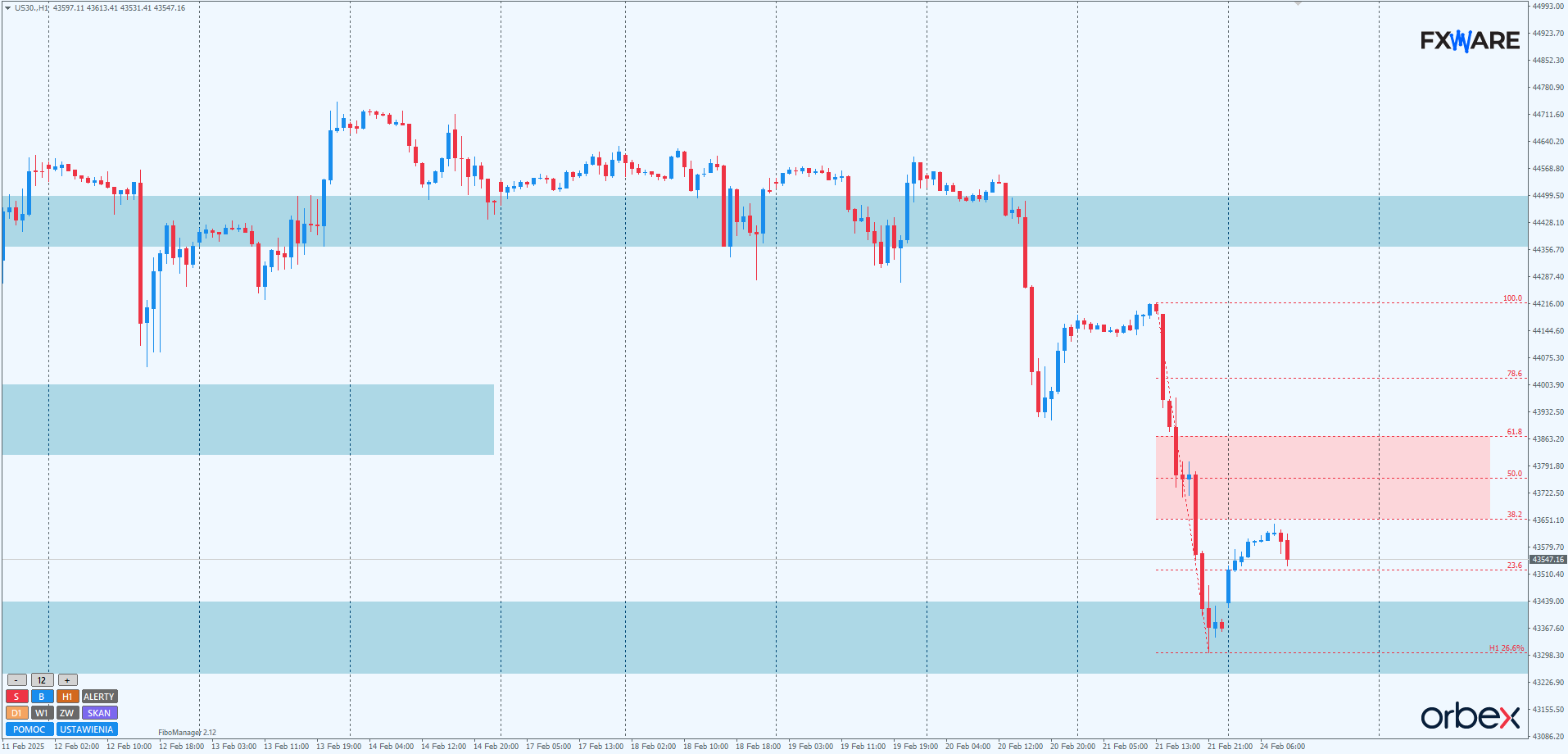 Na H1 silny krótkoterminowy trend spadkowy z wyraźnie zarysowaną strukturą szybkich impulsów i wolniejszych korekt. Aktualnie cena dotarła do zniesienia Fibonacciego 38,2% piątkowego spadku. W strefie 38,2–61,8 znajdują się interesujące dla podaży poziomy do ponowienia shortów w przypadku dalszych spadków. W wariancie z korektą opisanym wyżej RN 44 000 znajduje się nieco wyżej od zniesienia 61,8%. Jeśli cena tam dotrze, można spodziewać się wzmożonej reakcji podaży. Dotarcie tam na małym momentum w ciągu 1–2 sesji jeszcze bardziej zwiększa prawdopodobieństwo takiej reakcji niedźwiedzi.