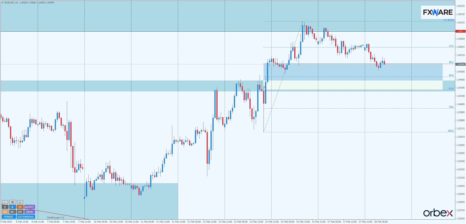 Na wykresie H1 widać wyraźnie zmniejszone momentum dwudniowej korekty zeszłotygodniowych impulsów. Najistotniejsze wydaje się w chwili obecnej zachowanie ceny na poziomie 1.043, gdzie przebiegają lokalne szczyty z 12 i 13 lutego. Zbudowanie silnego momentum przez popyt z tego miejsca będzie dobrym prognostykiem do dalszych wzrostów.