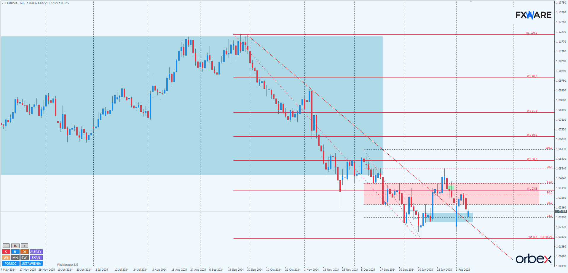 W miejscu, gdzie obecnie znajduje się cena, przebiega również strefa styczniowej konsolidacji. Sprawia to, że okolice 1.02500–1.03000 mogą być uważane przez byki za dobre miejsce na ponowienie zakupów. Wszelkie jednak zamknięcie świec dziennych poniżej 1.02500, a tym samym przebicie wspomnianej LT i strefy S/R, może upewnić niedźwiedzie, że wielomiesięczny trend spadkowy wciąż trwa i warto ponownie zbadać poziom styczniowych minimów. Taki obrót zdarzeń byłby katastrofalny dla koncepcji, w której minima z 13 stycznia są początkiem nowego średnioterminowego trendu wzrostowego.
