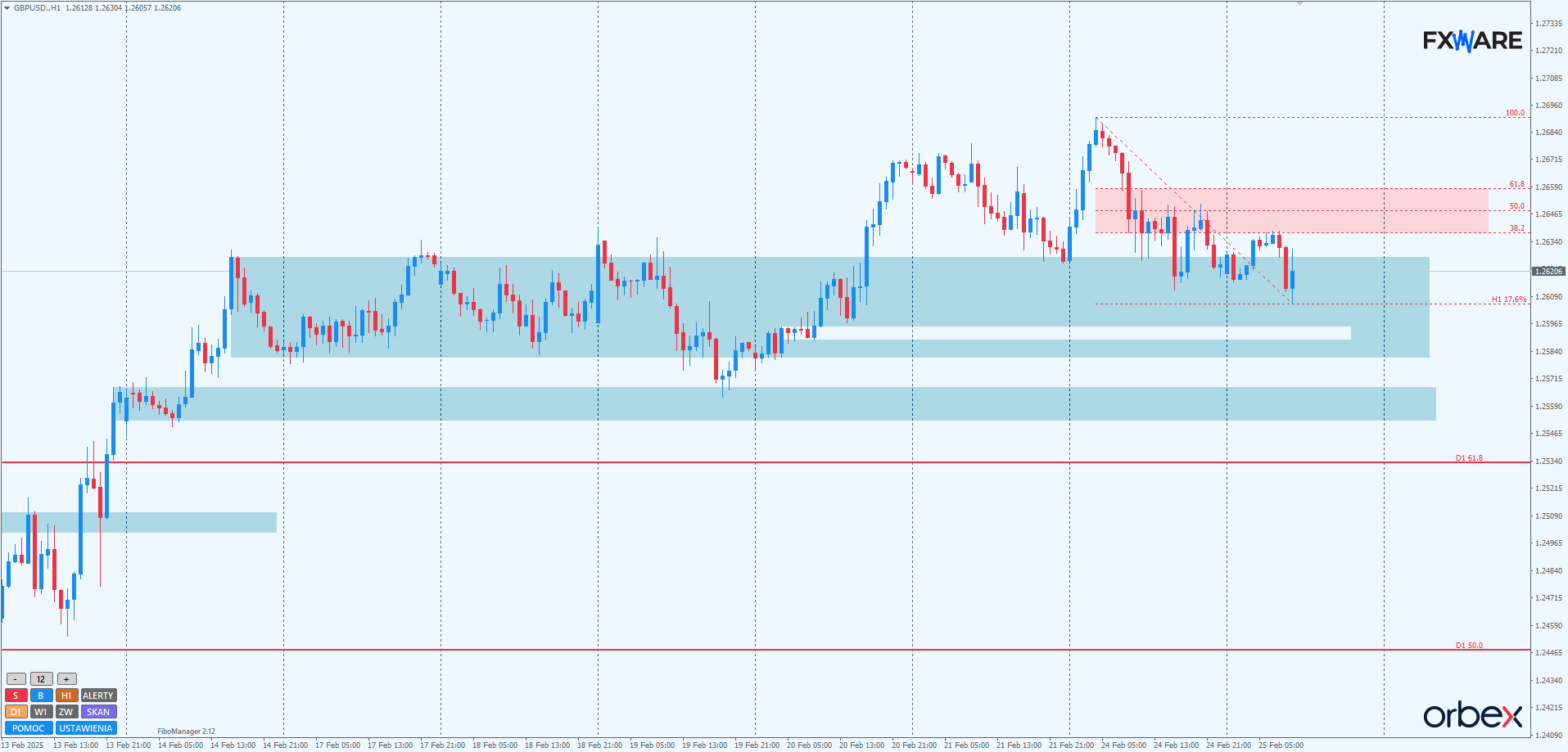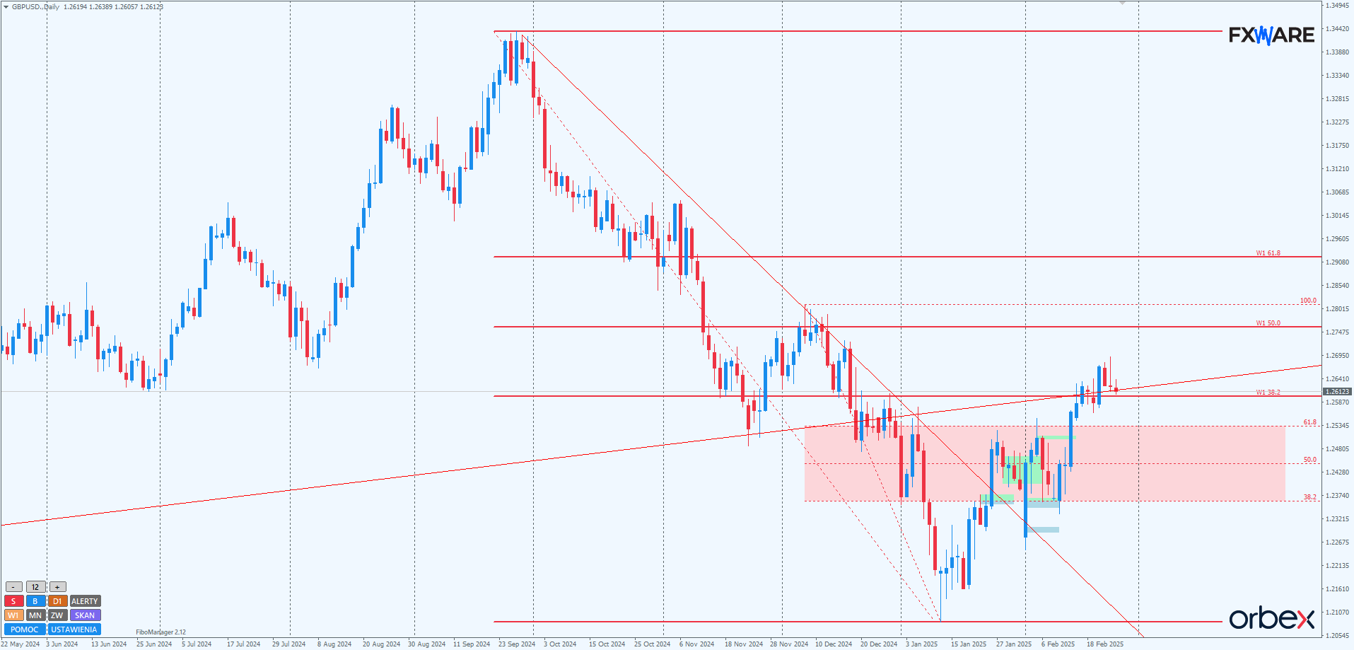 Wydaje się, że byków nie powstrzymało jak na razie ani zniesienie 38,2 trendu spadkowego mierzonego od września 2024, ani kolejny raz retestowana od dołu długoterminowa LT. Ostatnie trzy zamknięcia dzienne były już ponad tymi ograniczeniami dla byków. Może to świadczyć o ich determinacji, by głębiej wejść w strefę zniesień Fibo – być może po niewielkiej korekcie. Momentum najbliższych 2-3 sesji pozwoli lepiej ocenić szanse na taki rozwój sytuacji. Spadki do RN 1.25000, o ile rozciągną się na kilka dni, w żaden sposób takiego scenariusza nie zanegują.