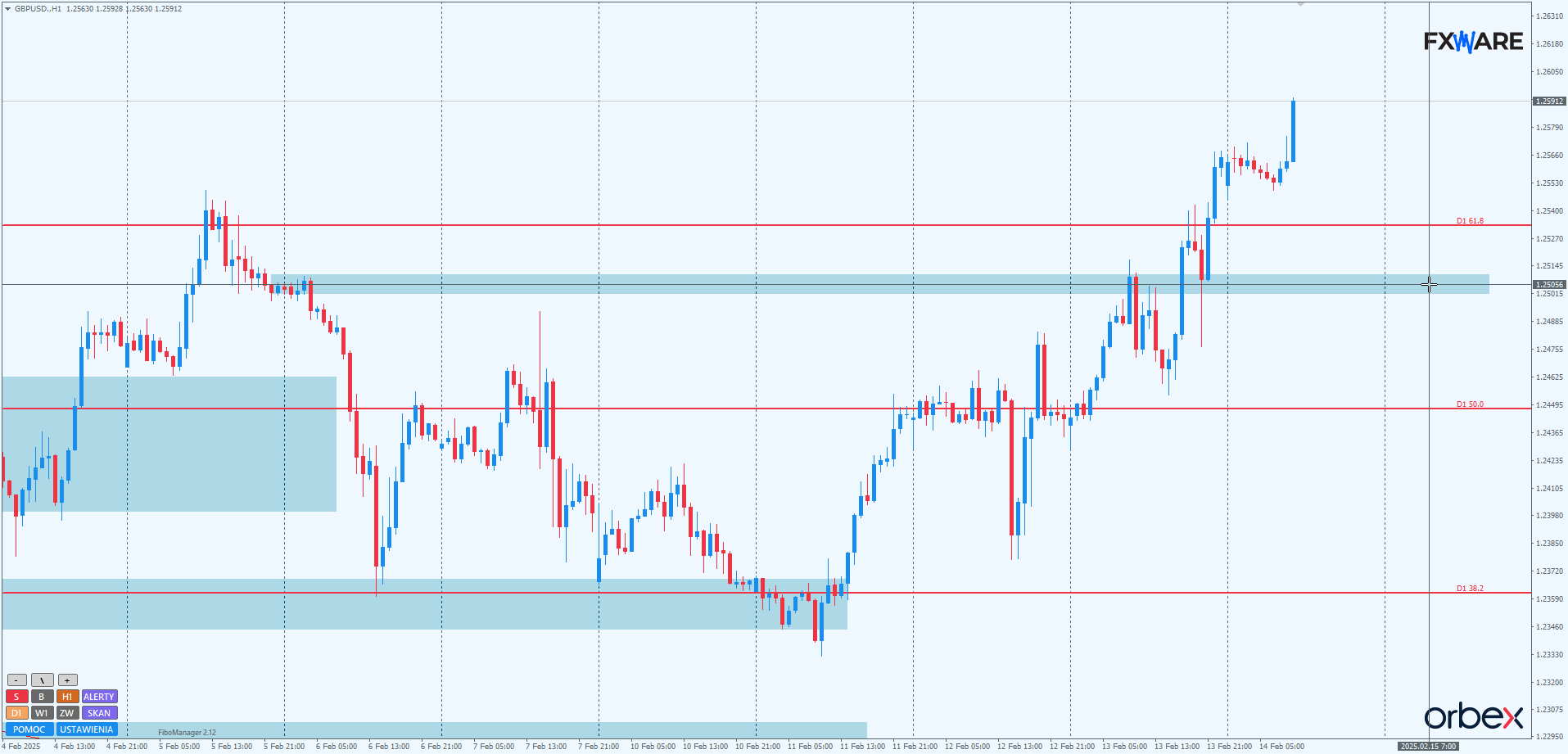 Na H1 nie widać żadnych zagrożeń dla aktualnej kampanii byków. Cena musiałaby spaść poniżej 1.25000, by rozważać jakiekolwiek spowolnienie albo zmianę tendencji. Jednak tylko wyjątkowej siły impuls, jak ten mający miejsce 12 lutego, mógłby w jakikolwiek sposób spowolnić w obecnej sytuacji byki i odwrócić tendencję wzrostową w ciągu jednej sesji.