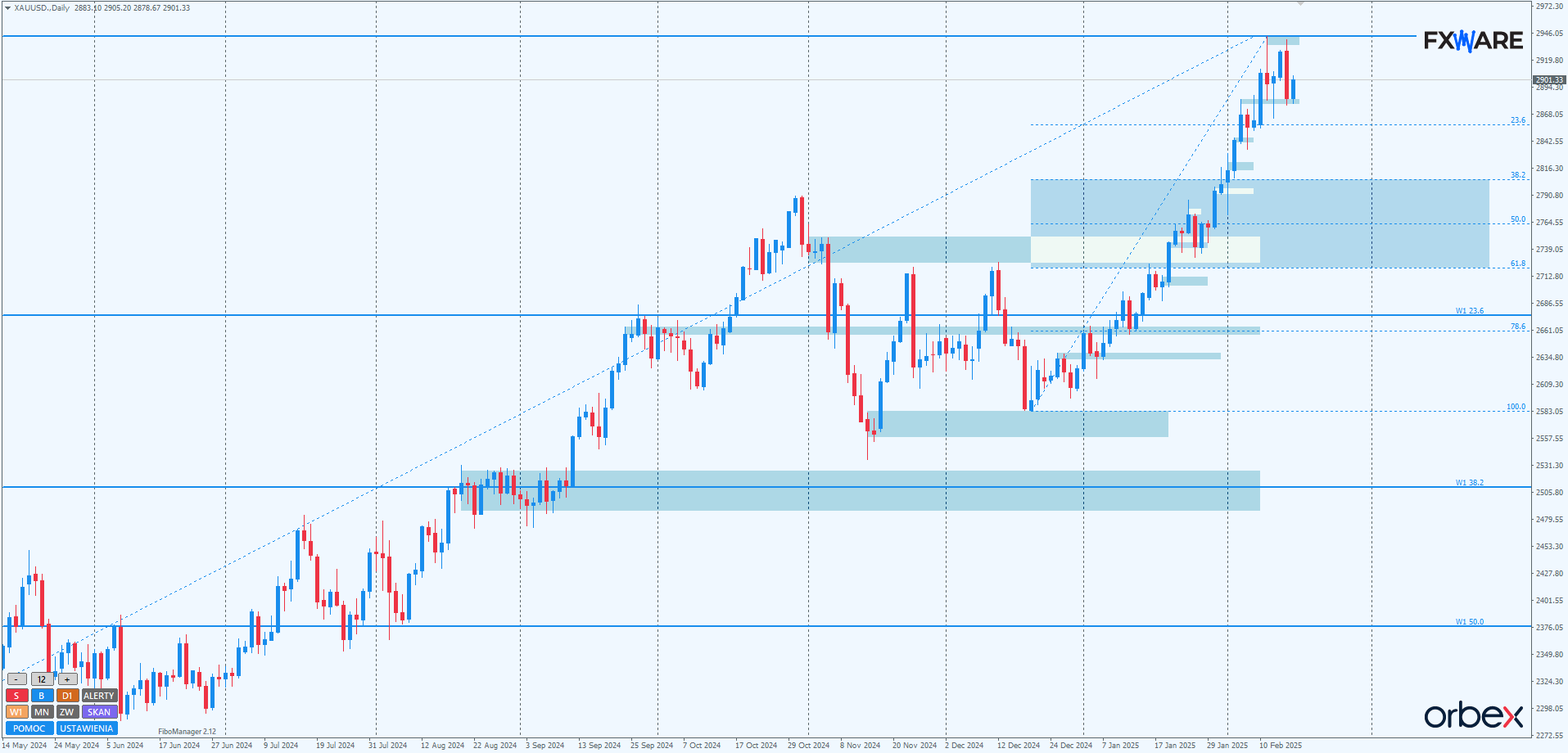 Złoto na wykresie D1 w piątek wyrysowało formację double top. Dodatkowo piątkowa świeca daily była engulficzna względem czwartkowej, co jest również formacją price action na poziomie ATH. Sam wymiar spadków z końcówki zeszłego tygodnia był największy od blisko dwóch miesięcy. To wszystko świadczy o tym, że niedźwiedzie znalazły w końcu jakiś punkt odbicia dla siebie.