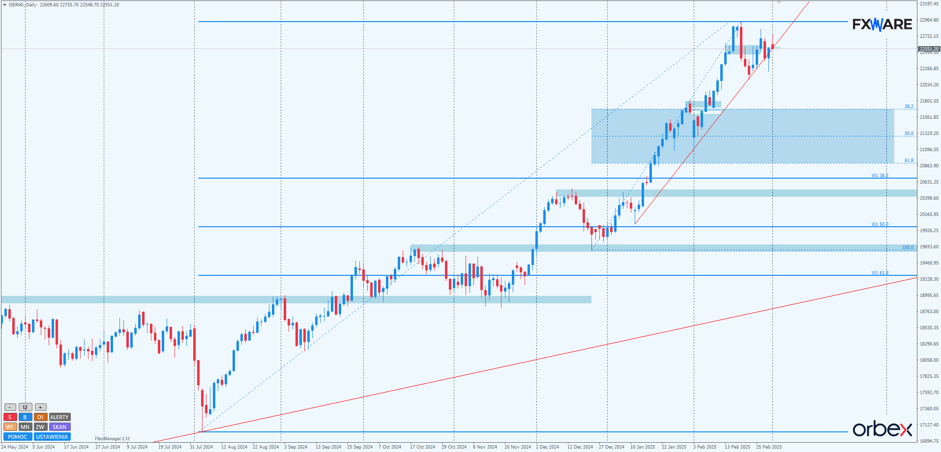 DAX rozpoczął nowy tydzień luką wzrostową. Wraz z piątkowym pinbarem, również o wymowie prorozrostowej, daje to nadzieję stronie popytowej na utrzymanie przyspieszonego trendu wzrostowego, w jakim indeks znajdował się od dwóch miesięcy. Aby tak się jednak stało, poziom RN 22500 musiałby zostać obroniony, a od miejsca, w którym znajdujemy się obecnie, byki musiałyby się popisać solidnym momentum wzrostowym, najlepiej windującym wykres w rejony ATH. Słabszy rozpęd na najbliższych 2–3 sesjach albo jakiekolwiek zamknięcie poniżej 22500 świecy daily może rozochocić niedźwiedzie do wyrysowania pełnej sekwencji spadkowej. Wtedy nawet 21800 nie byłoby bezpieczne w perspektywie kilku sesji, gdyby niedźwiedziom udało się odwrócić niekorzystne momentum w sposób, jaki dokonały tego byki w piątek.
