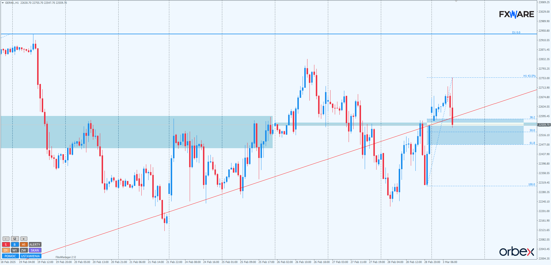 Na wykresie H1 widoczna jest niesamowita mobilizacja popytu, jaka nastąpiła w ostatnich godzinach handlu w piątek. Byki nie tylko zanegowały sekwencję spadkową rysowaną przez podaż od połowy zeszłego tygodnia i pięknym V-shaped reversalem wróciły w okolice piątkowych maksimów, ale dzisiaj zdołały już ustanowić zamknięcia ponad SR 22560, a także LT przyspieszonego trendu wzrostowego. Jeśli te dwa miejsca, działające teraz jako wsparcia, zdołają utrzymać odpowiedź niedźwiedzi w ryzach i zaobserwujemy od nich kolejny impuls w górę, to przebicie zeszłotygodniowych maksimów jest realne nawet w ciągu dzisiejszej sesji. Alternatywnie, spadek pod LT i SR na 22560, domknięcie luki weekendowej, brak aktywizacji byków w strefie zniesień Fibo swingu liczonego od piątkowego wieczoru – to wszystko może świadczyć o tym, że piątkowy zryw popytu był tylko epizodem.