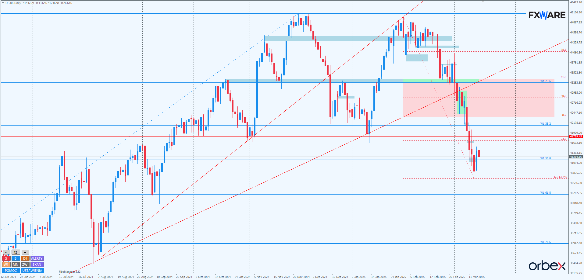 Wszelkie ruchy spadkowe, jeśli trwałyby kilka sesji, ale nie ustanowiły nowego minimum względem zeszłego tygodnia, będąc w cieniu tej piątkowej świecy, zachęcały by byki do jakiejś dłuższej korekty w półtoramiesięcznym trendzie spadkowym. Pierwszym celem byłby zapewne poziom 41800, który zgodnie z zasadą zmiany biegunów stanowi teraz opór. Korekta do tego miejsca nie zaburza również jednorodności dotychczasowego trendu i wpisuje się w jego sekwencję.