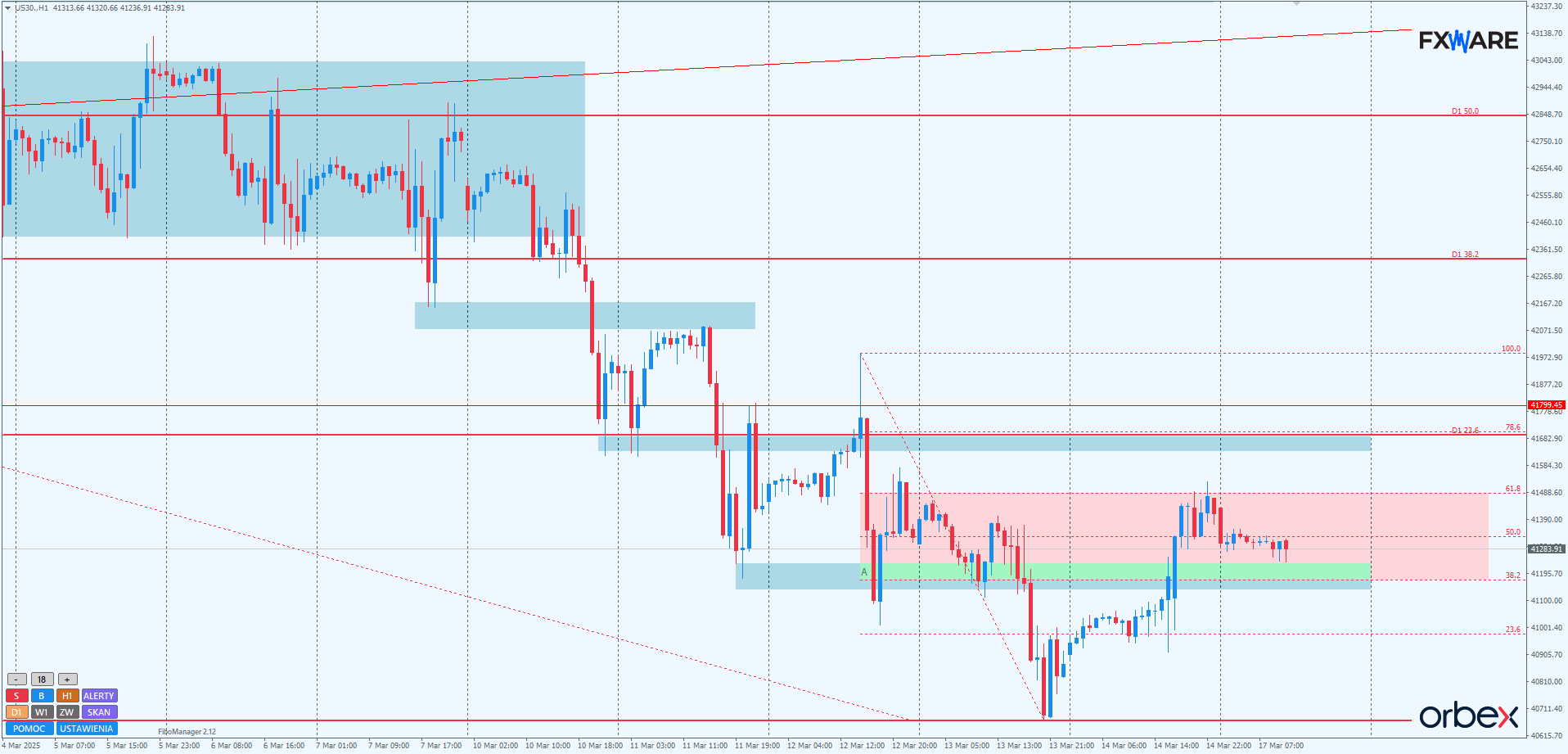 Na H1 cena znajduje się w strefie zniesień Fibo swingu spadkowego zapoczątkowanego w środę, obecnie w okolicach pivota. 61,8 co prawda powstrzymało byki, jednak momentum, jakim popisały się niedźwiedzie w odpowiedzi, nie zachwyca w żaden sposób. Jeśli struktura zostanie zachowana, to test od dołu kolejnej strefy SR na poziomie RN 41700 jest dość prawdopodobny. Do momentu przebicia od góry RN 41000 struktura aktualnej korekty pozostaje niezagrożona.