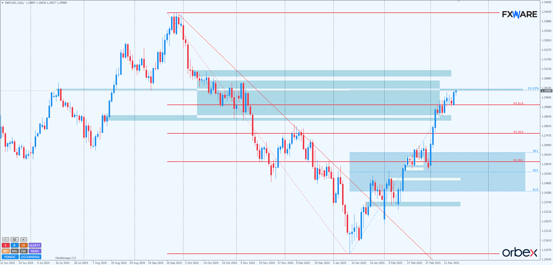 Funt coraz śmielej sobie radzi po pokonaniu ważnego poziomu Fibonacciego 61,8. Przez kilka dni stanowił on wsparcie dla byków, które wczoraj odniosły kolejne istotne zwycięstwo. Udało im się zamknąć świecę dzienną w formie bliskiej marubozu z minimalnym knotem, jednocześnie obejmującą swoim body wcześniejsze doji i pinbary, które dawały nadzieję niedźwiedziom na szybką korektę. Tak wysokie zamknięcie spowodowało, że faza przyspieszona dwumiesięcznego trendu wzrostowego jest już w pełni ukonstytuowana. Istotne teraz będzie zachowanie ceny na RN 1.3, do którego notowania kabla właśnie dotarły. Gdyby udało się niedźwiedziom sprowokować spadki, wtedy zasięgiem takiej korekty mogłoby być nawet 1.26500. Natomiast gdyby byki utrzymały wczorajsze momentum i w ciągu 1–2 sesji dotarły do RN 1.31, wtedy ewentualna korekta miałaby swój pierwszy target w okolicach 1.29500. Potencjalnie mogłaby być o wiele płytsza i nie zagroziłaby przyspieszonej fazie właśnie obserwowanych wzrostów.