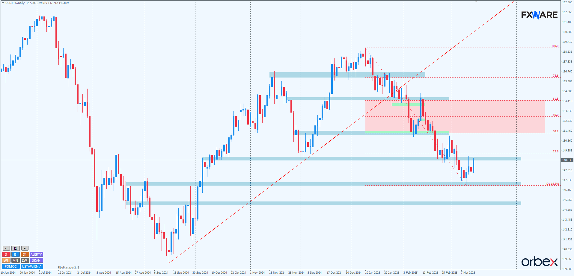 Na H1 zamknięcie w formie pinbara blisko przedwczorajszego szczytu sugeruje chęć poważniejszej obrony tego miejsca przez podaż. Jeśli tak by się stało, w okolicach RN 149 mógłby powstać double top, który zwiększałby szanse niedźwiedzi na mocniejsze zbicie ceny i być może wyrysowanie nowego lower low na interwale dziennym. Najbliższe kilka godzin rozstrzygnie tę kwestię. W przypadku rozpoczęcia takiego odwrotu pierwszą przeszkodą, na jaką mogą trafić niedźwiedzie, będzie strefa zniesień Fibo, aktualnie rozpościerająca się między RN 148.400 a 148.020.
