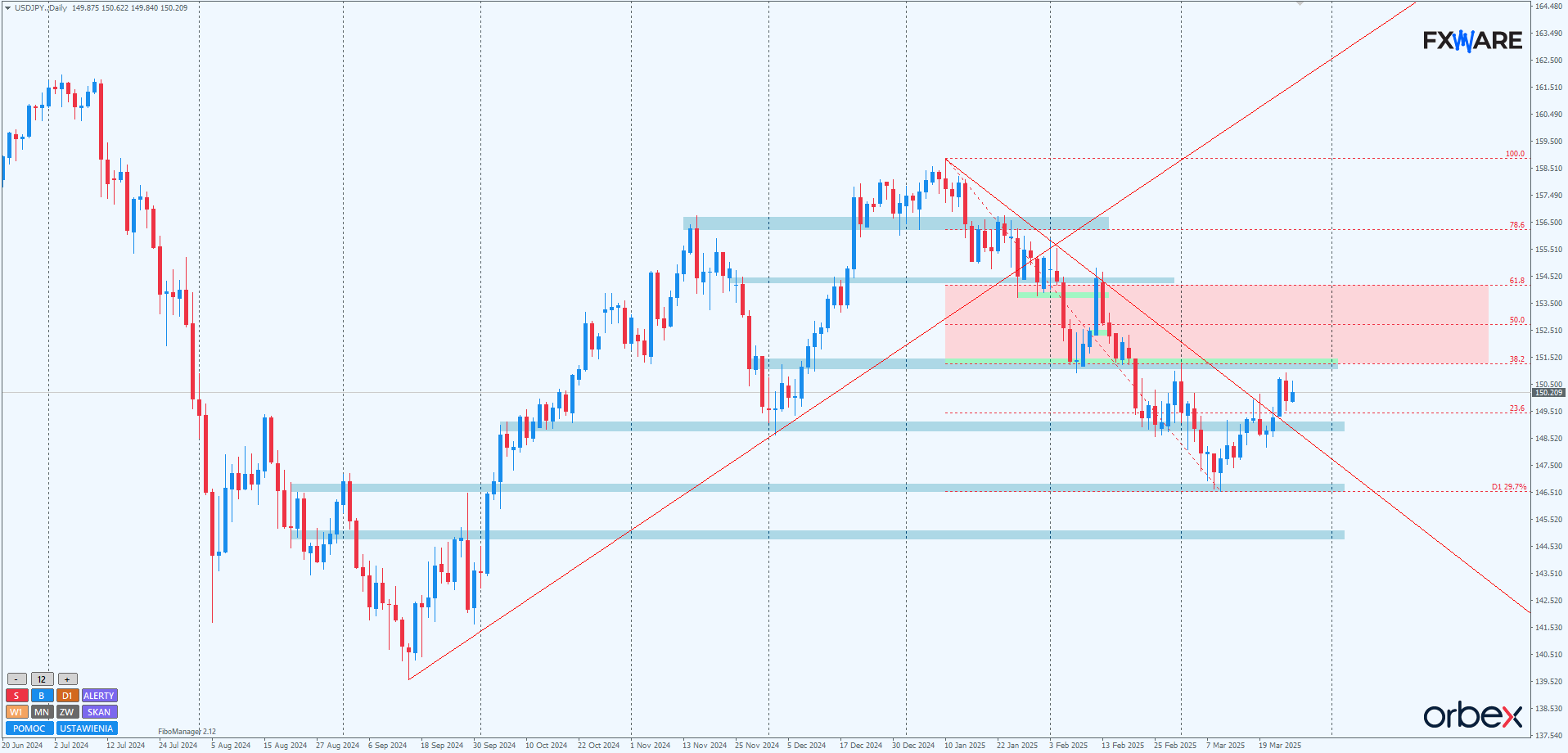 Jen na wykresie dziennym wyłamał się z dotychczasowej tendencji. Choć trochę za wcześnie, by powiedzieć, że definitywnie została ona zakończona, to na pewno jakaś jej jednorodna forma dobiegła końca. Cena aktualnie pozostaje w przedziale pomiędzy SR na poziomie RN 151.200 a przebitą LT. Na SR tym przebiega też poziom zniesienia Fibonacciego 38.2 trzymiesięcznego trendu spadkowego. Wzmacnia to go jako potencjalny opór. Dość prawdopodobne będzie rozszerzające się oscylowanie ceny pomiędzy tymi ograniczeniami. Warto obserwować zachowanie ceny na tych ekstremach i momentum, jakie tam się pojawi.