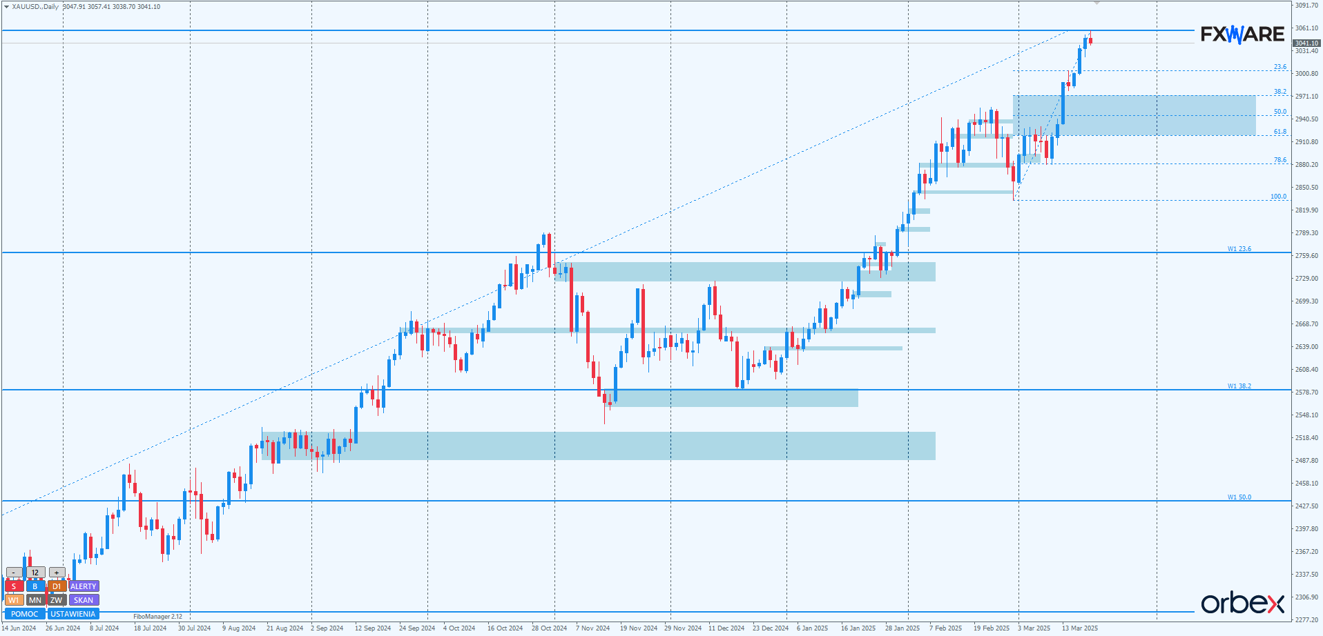 Złoto wciąż znajduje się w trendzie wzrostowym, w silnym, jednorodnym i przyspieszonym swingu. Byki wydają się niezmordowane w swoim apetycie na coraz większe zakupy po coraz wyższych cenach. Kilka dni korekty w okolicach poziomu 2950 to już przeszłość, a lutowe maksima, od których nastąpiła ta korekta, teraz mogą stanowić co najwyżej cel dla korekty i działać jako dalsze wsparcie dla byków. Nawet psychologiczny RN 3000 nie spowodował przebudzenia niedźwiedzi. Dychawiczny pinbarek, który wygenerowały na tym poziomie, wydaje się być całkowicie zignorowany przez rozpędzone byki. Codziennie jest ustanawiane nowe ATH. Trendy długo-, średnio- i krótkoterminowy nie są zagrożone w żaden sposób, nawet ich aktualnie trwające przyspieszone fazy. Dopóki niedźwiedzie nie wygenerują jakiegoś solidnego momentum spadkowego, nie ma mowy o zakończeniu aktualnej tendencji.