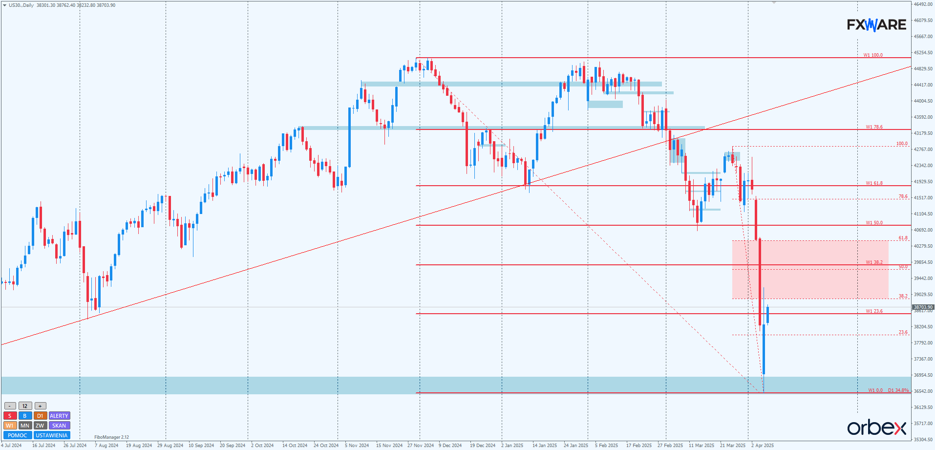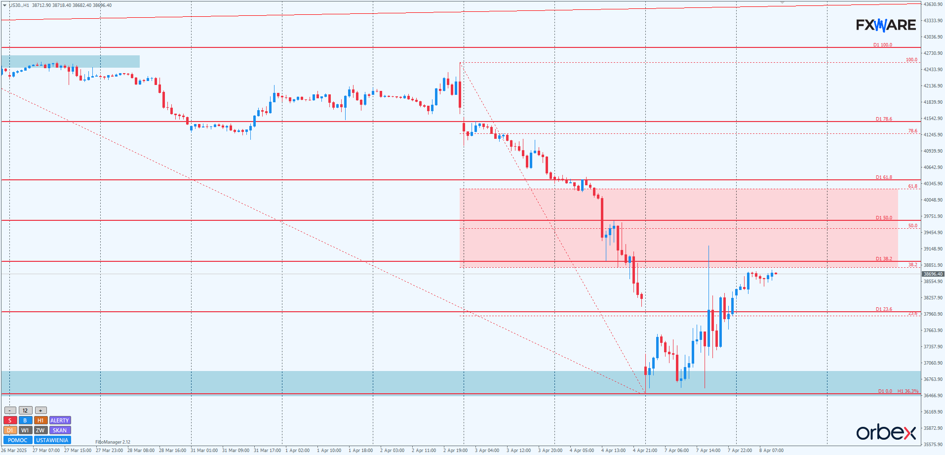 Na wykresie dziennym odbicie od wspomnianego 36500 było na tyle silne, że pozwoliło już w poniedziałek wybrać zakres olbrzymiej luki otwarcia, z jaką mieliśmy do czynienia po weekendzie. Obecne wzrosty, jeśli utrzymają momentum, mają szansę na dotarcie dziś bądź jutro do strefy zniesień fibo swingu mierzonego od szczytów z drugiej połowy marca. Jeszcze jest za wcześnie, by ocenić momentum tego ruchu powrotnego w pełni. Szansa na to, że będzie on równie szybki jak impuls w dół, ciągle jest jeszcze na dziś realna. Warto jednak mieć na uwadze, że wszelkie spowolnienie, jeśli tylko wystąpi – a takie może się zdarzyć przy docieraniu do ważnych poziomów fibo 2-miesięcznego trendu spadkowego – może w każdej chwili zasygnalizować niedźwiedziom słabość byków. Tym samym może dać sygnał do rysowania kolejnego silnego impulsu spadkowego. Gdyby do tego doszło, poprawienie minimów z tego tygodnia i przebicie od góry 36500 spowodowałoby epickie spadki porównywalne z covidowymi z 2020 roku.