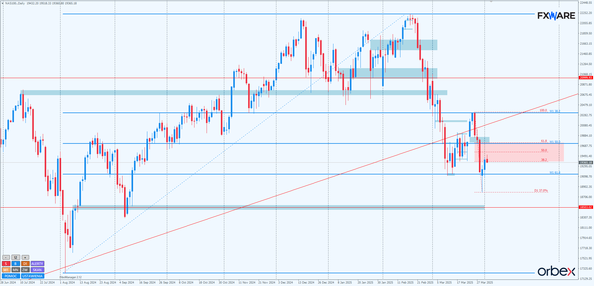 W zeszły piątek Nasdaq na bardzo dużym rozpędzie uderzył w poziom Fibo 61,8 ośmiomiesięcznej sekwencji wzrostowej. Poziom ten w pierwszej połowie marca już raz uratował skórę bykom, tworząc double bottom i windując cenę aż do retestu Fibo 38,2. Na wspomnianym poziomie świeca daily zamknęła się w formie prowzrostowego pinbara. Sprawiało to, że obecnie znajdujemy się w swingu wzrostowym, korygującym spadki z zeszłego tygodnia. Momentum tej korekty jest mniejsze niż w zeszłotygodniowym impulsie niedźwiedzi, co zwiększa szanse na to, że po dotarciu do strefy zniesień Fibo te ponownie się uaktywnią. Jeśli i od tej strefy pokuszą się o kolejny impuls, RN 18500 może zostać osiągnięte jeszcze w tym tygodniu. Do momentu przebicia od dołu i uzyskania zamknięcia powyżej psychologicznego RN 20000, taki scenariusz pozostaje niezagrożony.