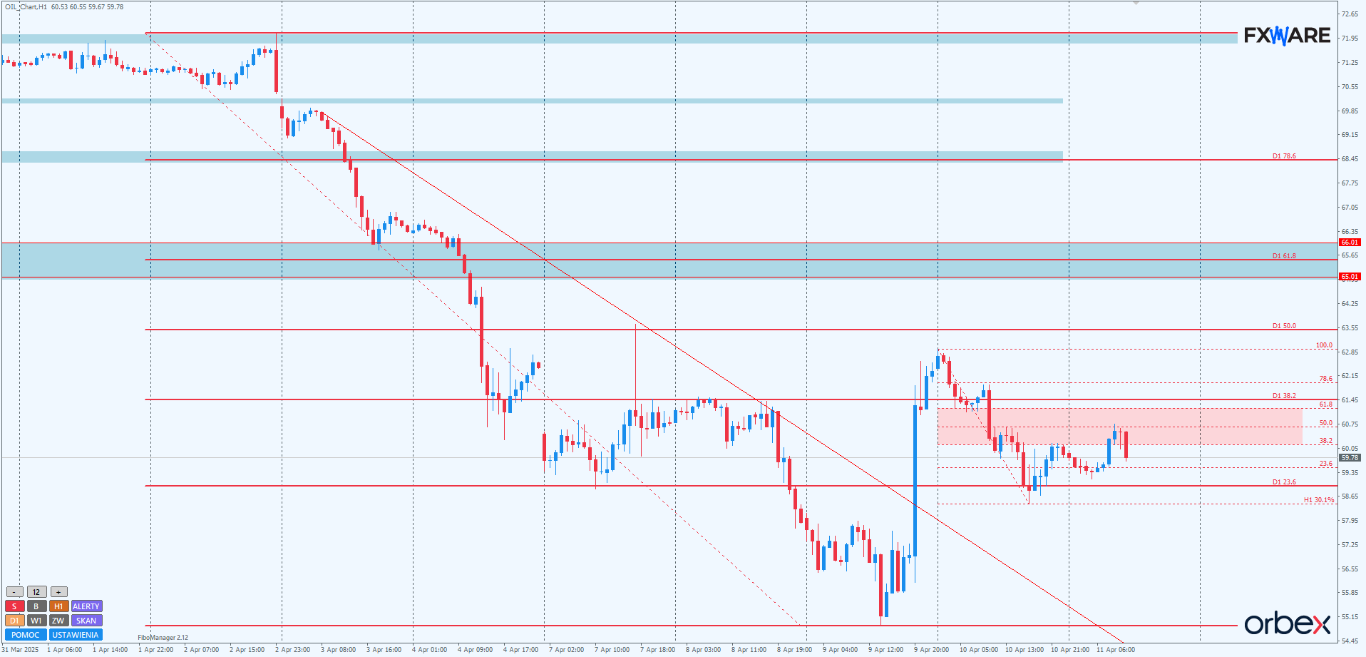 Na H1 cena dotarła do pivota strefy zniesień Fibonacciego mierzenia wczorajszej korekty. Momentum tego ruchu nie było porywające. Nie na tyle, by byki mogły go traktować jako kolejny impuls po środowym wystrzale w górę. Stwarza to podaży dobrą szansę na zejście niżej w kierunku przełamanej, a nie testowanej lini trendu. Być może tam, w okolicach 55,70 $, na poziomach konsolidacji ze środy, byki ponownie mogły wykazać się zwiększoną aktywnością i zacząć rysować drugi impuls w swojej sekwencji. Gdyby do tego nie doszło, a ruch z aktualnego miejsca osiągnął te rejony jeszcze dzisiaj, to wtedy podaż miałaby szansę na poprawienie minimów ze środy i zanegowanie pro-wzrostowego pinbara z D1. To z kolei mogłoby odsunąć w czasie wizję retestu od dołu SR 65-66$.