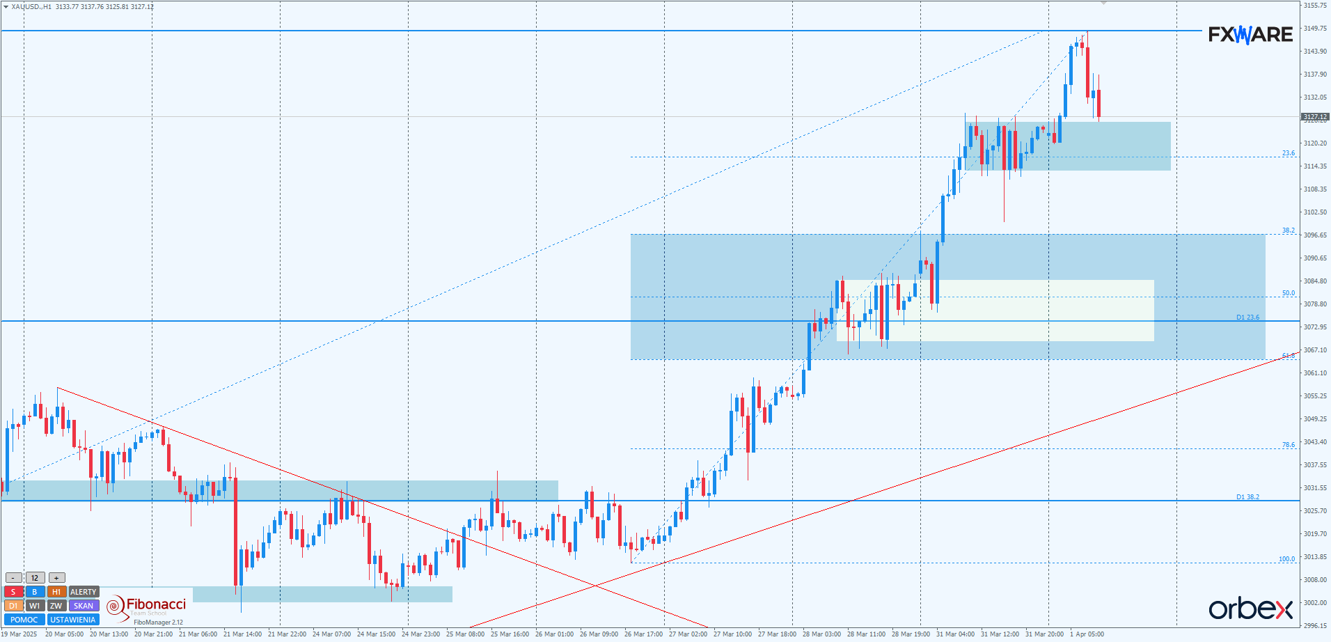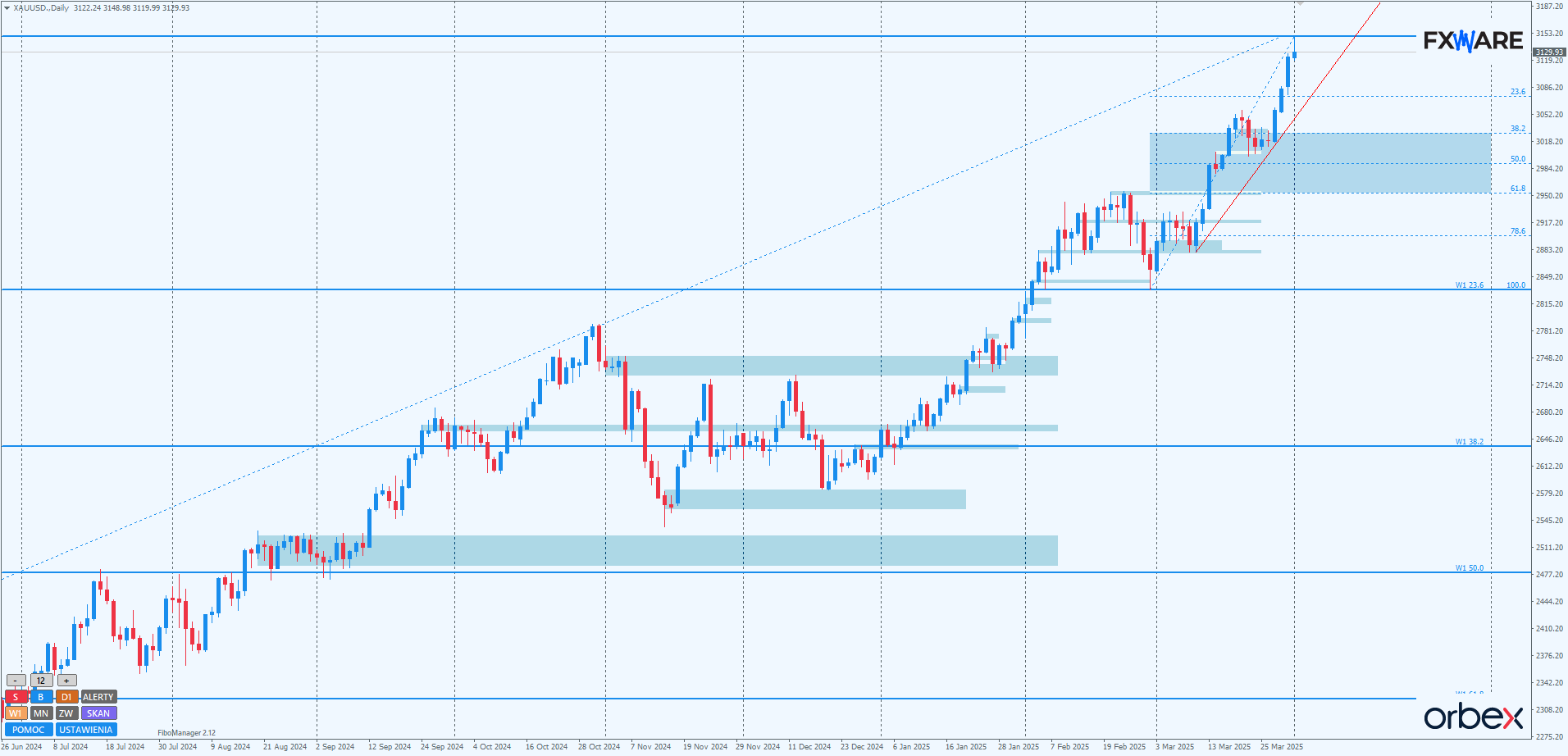 Na wykresie dziennym cena złota znajduje się w fazie przyspieszonego trzymiesięcznego trendu wzrostowego. Aktualny swing jest szybki i jednorodny – od czterech sesji codziennie ustanawiane są nowe ATH. Poza kolejnymi RN, jak na przykład 3150, na którym obecnie trwają chwilowe zmagania, nie widać czynników, które mogłyby obrócić sytuację na korzyść podaży. Wręcz przeciwnie, można zaobserwować wyraźne przyspieszenie. Sprawia ono, że całe marcowe wzrosty mogą być częścią dłuższego i szybszego impulsu niż tego z początku stycznia do połowy lutego.