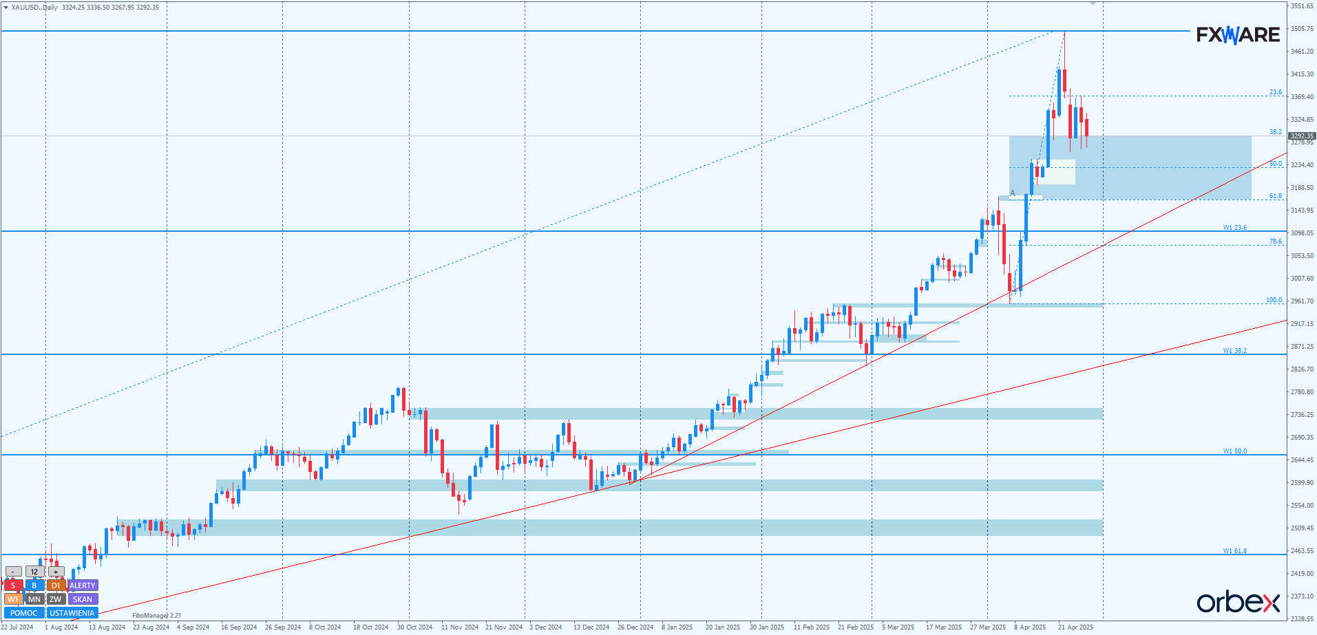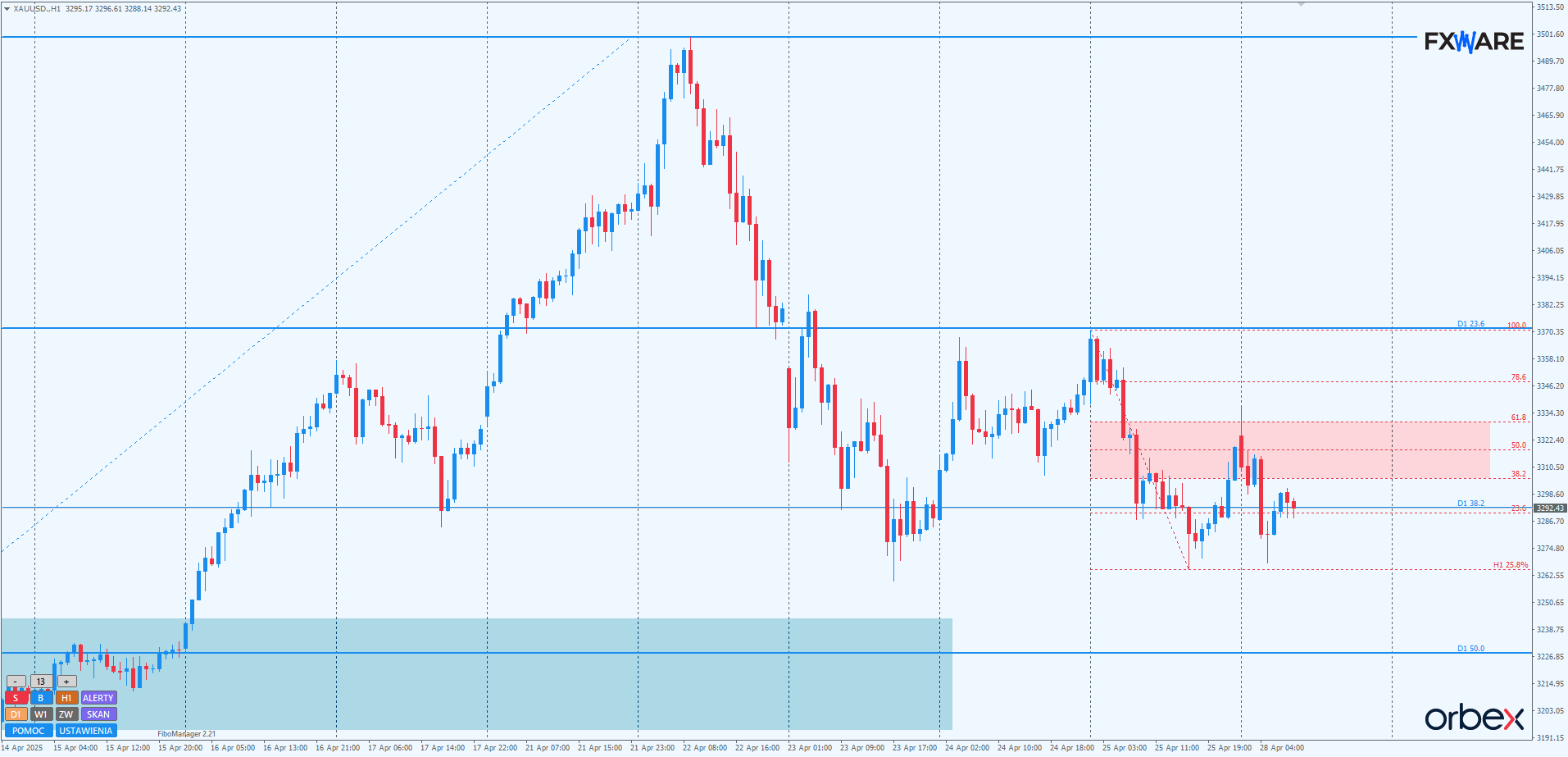 Na wykresie dziennym złoto konsoliduje w strefie 3355–3270. Z punktu widzenia PA ruchy od góry ogranicza zeszłotygodniowa luka, a od dołu poziom fibo 38,2 strefy zniesień swingu zapoczątkowanego 7 kwietnia. Wspomniany poziom 38,2 niedźwiedziom udawało się jak na razie naruszyć tylko knotami. Pokazuje to, jak pomimo potężnego pinbara naznaczającego ostatnie ATH, byki wciąż próbują zakupów już w pierwszych dogodnych dla siebie miejscach. Utwierdza to przekonanie, że wielomiesięczny trend wzrostowy nie jest w żaden sposób zagrożony. Nawet zejścia w okolice pivota strefy zniesień fibo, gdzie znajduje się też ostatnia strefa konsolidacji, czy nawet zniesienia 61,8 wspomnianej strefy, w średnim i długim terminie nie zagrożą jak na razie bykom.