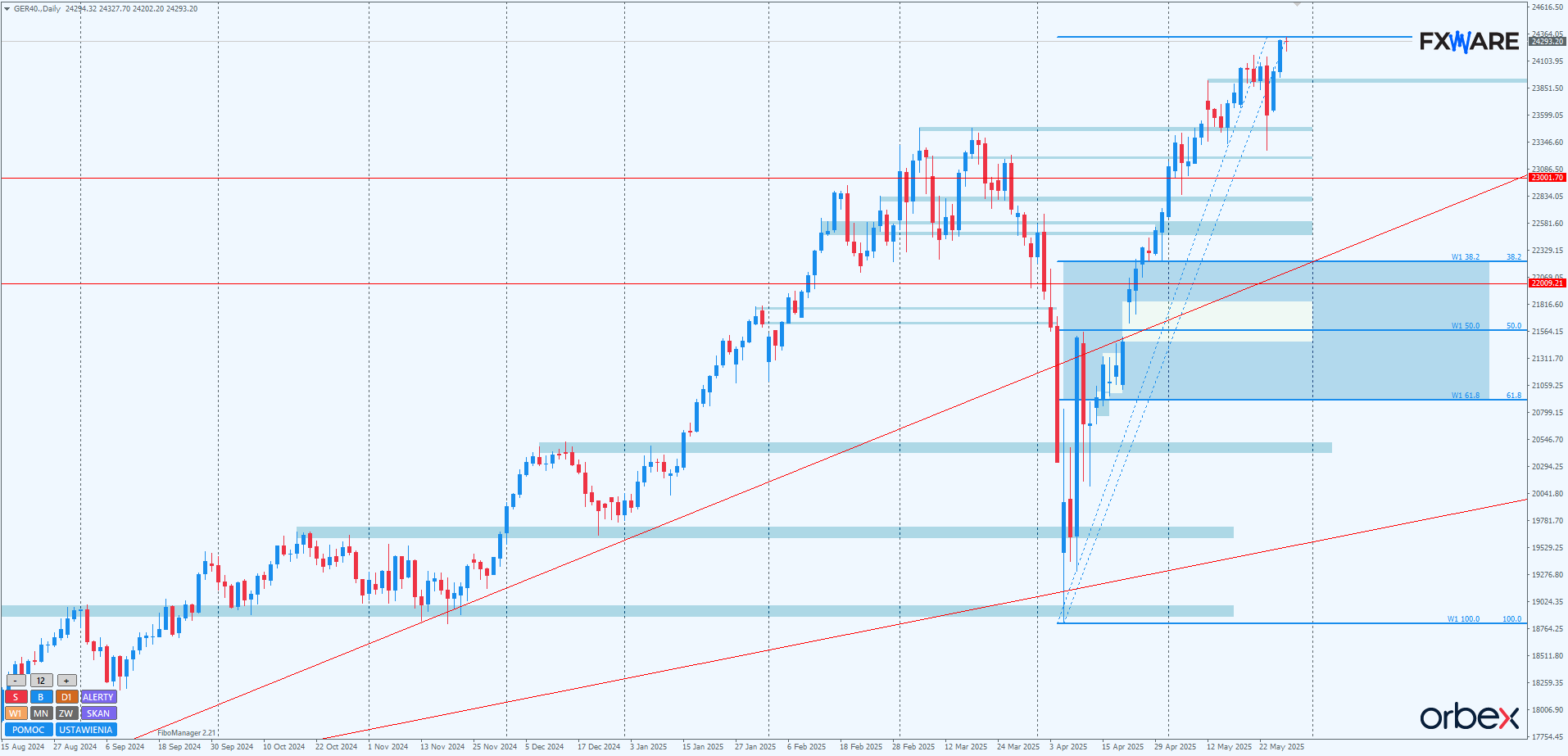 Zengulfowany double top z okolic 24100 będzie teraz stanowił wsparcie. Dodatkowo dość spore momentum, jakim popisują się byki od początku tygodnia, będzie trudne do szybkiego zanegowania. W przypadku rozpoczęcia kolejnej korekty warto obserwować momentum ruchu powrotnego, by na tej podstawie ocenić, jakie ma ona szanse na zagrożenie aktualnej, blisko 2-miesięcznej sekwencji wzrostowej. Dopiero osiągnięcie 23500 – i to na sporym momentum – mogłoby być niepokojące dla byków w średnim terminie. Wszelkie korekty na małym momentum do miniętych SR będą raczej wykorzystywane przez popyt do zawierania kolejnych longów.