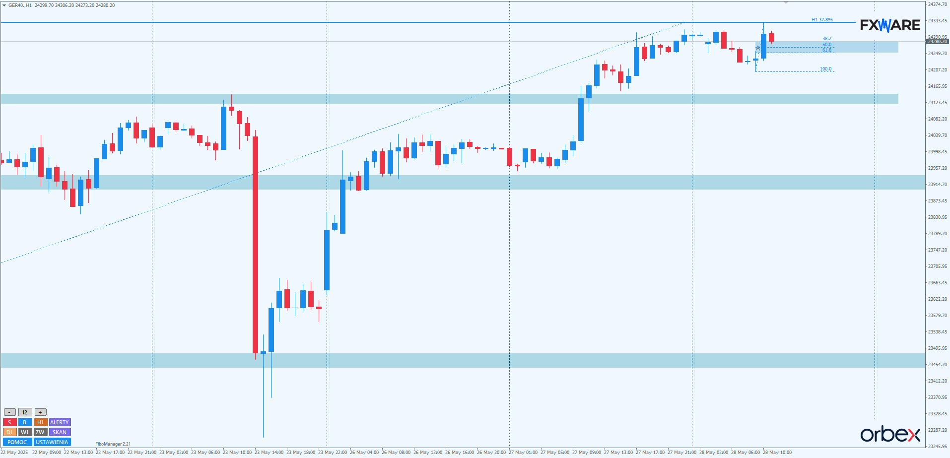 Na interwale H1 chwilowa porażka byków z zeszłego tygodnia szybko została przekuta w ich sukces. Zarówno poniedziałkowy impuls o sporym momentum, jak i wczorajszy, całkowicie zanegowały już piątkowe tąpnięcie. Wszelki odpoczynek byków sprowadza się zaledwie do konsolidacji. Ruchy w górę są tak silne, że poziomy wyjściowe po wybiciach z konsolidacji nie są retestowane od góry. Dziś już ponownie ustanowione zostało ATH na sporym momentum. Choć cena na razie wydaje się odbijać od maksimów z przełomu sesji, sam układ momentum wskazuje na większe prawdopodobieństwo ustanowienia kolejnych szczytów jeszcze w ciągu dzisiejszej sesji. W przypadku korekty pierwszymi docelowymi poziomami będą SR-y na 24130 oraz strefa konsolidacji na RN 24000.