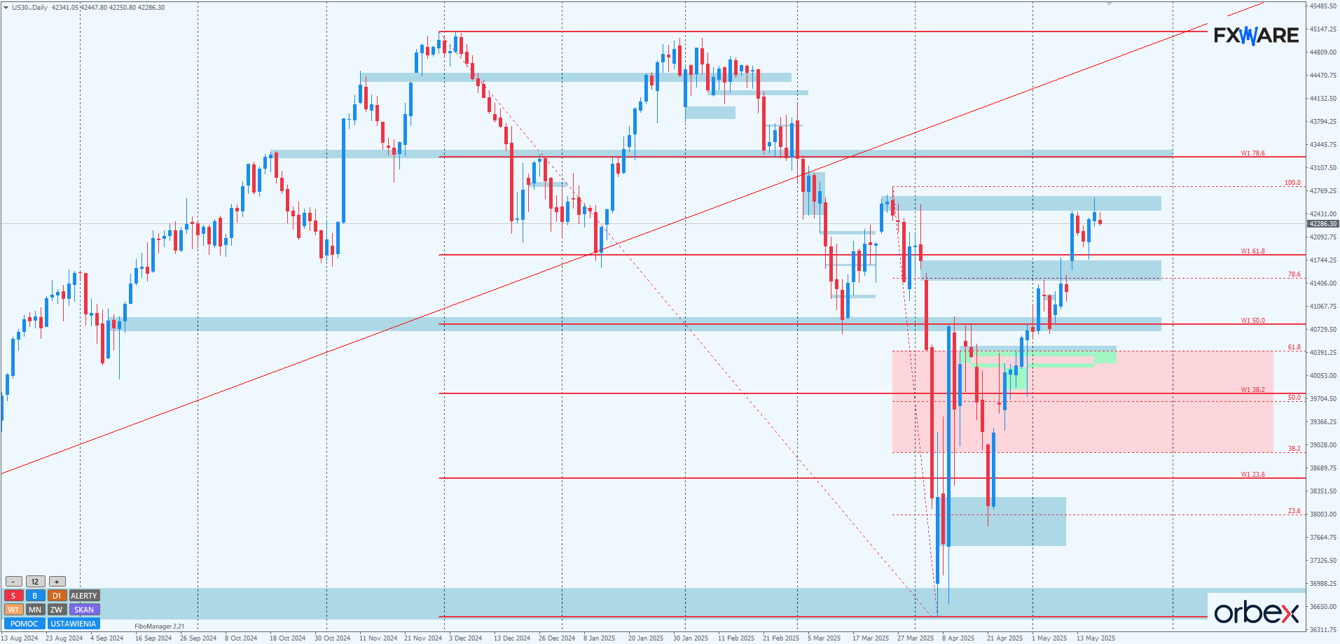 Dow Jones na wykresie dziennym nadal w blisko miesięcznym już swingu wzrostowym. W piątek byki lekko wyhamowały w formie pinbara, a dzisiejsze otwarcie miało miejsce z luką pro spadkową. Choć sama ta średnioterminowa formacja wzrostowa nie jest zagrożona, to warto zauważyć, że jeśli piątkowy pinbar nie zostanie szybko zanegowany i stanie się lokalnym szczytem, może to oznaczać kilkudniową korektę w kierunku dużo większej luki z zeszłego tygodnia. Jej zakres nie został jeszcze wybrany, a spadki nawet w tamte okolice nie spowodowałyby jakichś poważnych konsekwencji dla byków. Wraz z luką z początku kwietnia obszar w okolicach 41500 działa teraz jako wsparcie. By zanegować taki scenariusz, byki musiałyby podczas dzisiejszej sesji, a najpóźniej jutro, wyrysować wzrostową D1 z solidnym body zamykającym się powyżej 42700. Wtedy nawet faza przyspieszona wzrostów, trwająca od zeszłotygodniowej luki, byłaby kontynuowana.