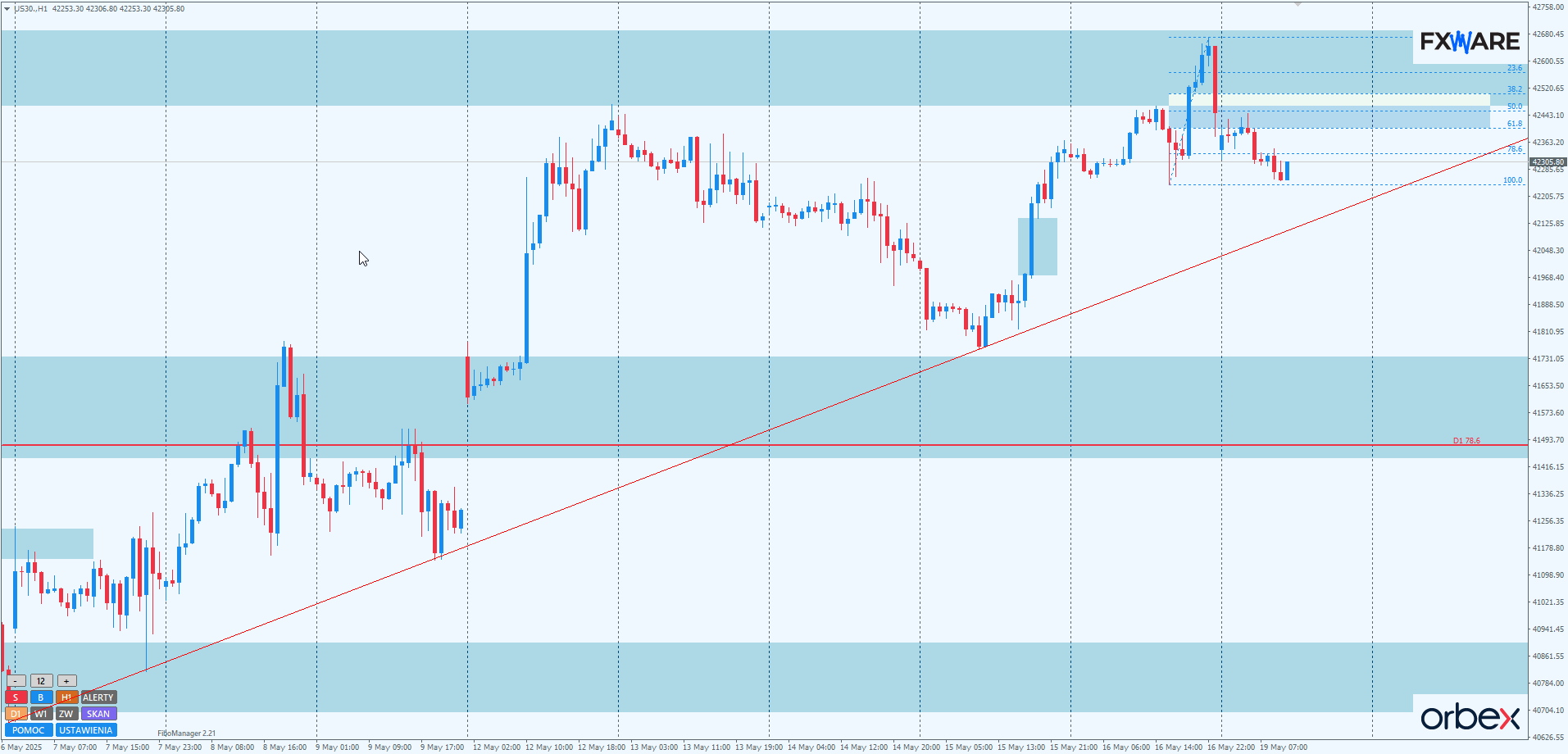 Na H1 blisko 2-tygodniowa sekwencja nie jest zagrożona. Można jednak zauważyć, że false break nieskutecznie windujący cenę ponad zeszłotygodniowe maksima nadał niedźwiedziom dodatkowego animuszu. Jeżeli LT, aktualnie znajdująca się na wysokości 41150, padłaby dzisiaj, mogłoby to oznaczać akcelerację krótkoterminowych spadków. Bykom nie pomoże też obszar fair value gap pomiędzy 42145 a 41980. Może on przyspieszyć spadki, gdyby notowania obniżyły się do jego poziomu, a LT nie okazała się tak skuteczna w generowaniu byczych reakcji, jak przez ostatnie 2 tygodnie.
