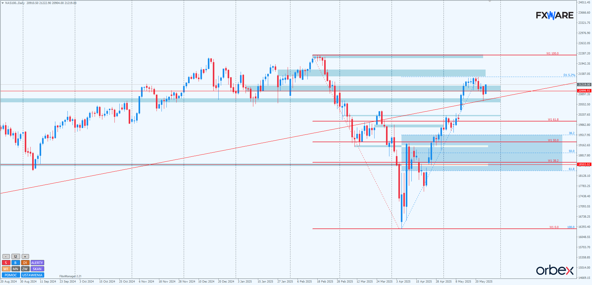 Na wykresie dziennym NASDAQ odbił się od SR w okolicach 20700 i ponownie stara się sforsować RN 21000 – tym razem od dołu. Kluczowe będzie dzisiejsze zamknięcie. Jeśli bykom uda się zamknąć w okolicach 21100 lub wyżej, wymowa piątkowego tapnięcia, zakończonego jednak sporym dolnym knotem, oraz takiego wysokiego zamknięcia wskazywać będzie na to, że znajdujemy się w kolejnym silnym impulsie byków. Natomiast zamknięcie poniżej 21000 i pozostawienie na dzisiejszej świecy dziennej sporego górnego knota może oznaczać pogłębienie korekty. W takim scenariuszu dzisiejszy ruch w górę to tylko reakcja na konfluencję SR i starej LT, a osiągnięcie luki leżącej na 20200 w ciągu kilku dni stanie się bardziej prawdopodobne.