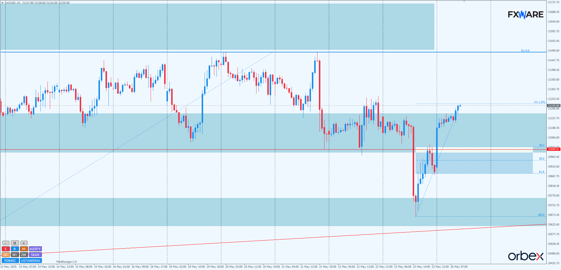 Na wykresie h1 wyraźnie widać, jak silna była reakcja byków zaraz po wznowieniu notowań w poniedziałek. Momentum – choć nie tak silne jak podczas piątkowego tąpnięcia – było umiejscowione w sposób pozwalający zachować strukturę wzrostową od minimów z zeszłego tygodnia. To cenne zwycięstwo popytu w kategoriach PA. Można wręcz odnieść wrażenie, że cała piątkowa wycieczka niedźwiedzi poniżej RN 21000 to tylko false break. Jeśli tak jest w istocie i podaż nie ponowi szybko spadkowego momentum, jakim popisała się w piątek czy środę, to atak na 3-miesięczne maksima może być kwestią 2–3 sesji.