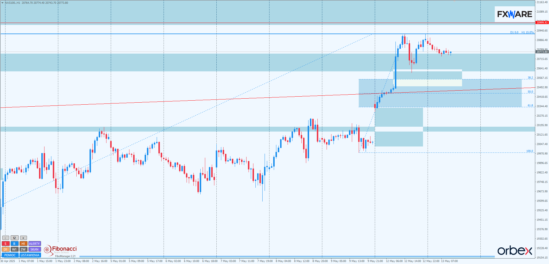 Na H1 inicjatywa jest także ewidentnie po stronie byków. Wczorajszy impuls doczekał się również impulsowej kontynuacji. Jest ona teraz kompensowana na słabym momentum, co zwiększa szanse popytu na wyrysowanie kolejnego impulsu w górę. Alternatywnie, gdyby okolice wczorajszego prowzrostowego pina nie przyniosły większej aktywności byków, korekta mogłaby się przeciągnąć i dotrzeć do strefy zniesień Fibo, która aktualnie rozciąga się pomiędzy 20350 a 20560. Pomiędzy 20500 a 20600 leży obszar fair value gap, który w przypadku pogłębiania korekty może być szybko pokonany i sam w sobie akcelerować spadki, nawet w kierunku luki weekendowej w dalszej perspektywie.