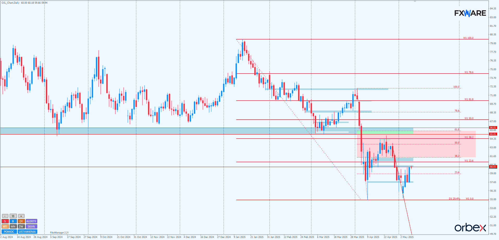 Na H1 cena dotarła do psychologicznego RN 60. Nie jest on tak kluczowy jak strefa 65–66$, ale ma swoją solidną historię indukowania reakcji. Za kilka godzin będą znane wyniki pierwszego ataku byków na ten poziom, który właśnie trwa. Momentum jest niewielkie, co może zwiastować problemy z trwałym pokonaniem tego poziomu. Niewykluczona jest też korekta do strefy zniesień Fibo swingu mierzonego od wczorajszych minimów i dopiero przypuszczenie poważniejszego ataku na większym rozpędzie jeszcze do końca tego tygodnia.