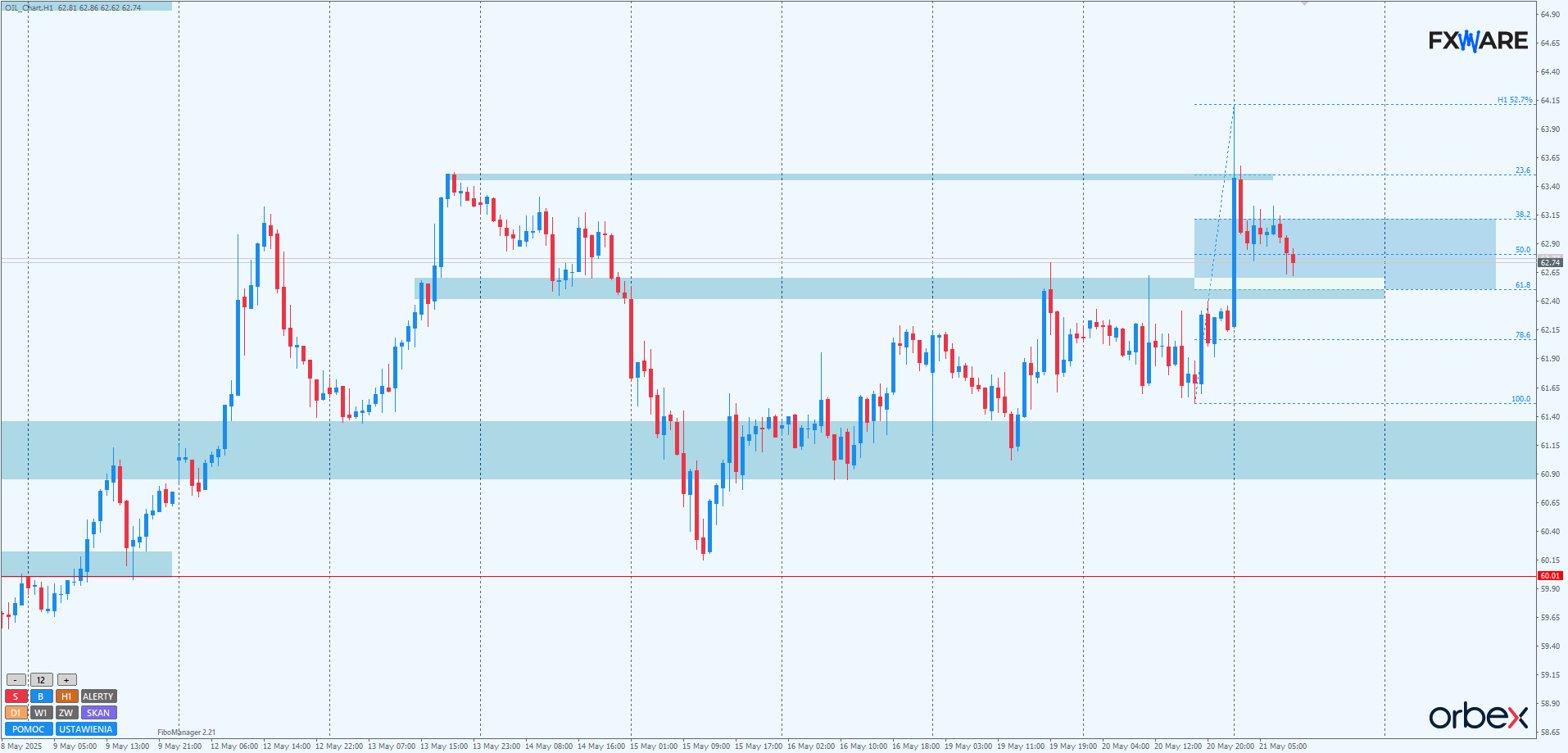 Na H1 trwa kompensowanie nocnego wystrzału. Ruch odbywa się na małym momentum. Poziom 62,50 ma potencjał obrony i odrzucenia powolnych niedźwiedzi, tym bardziej że na nim przebiega również poziom zniesienia 61,8% strefy zniesień liczonej od wczorajszych minimów. Cała kilkudniowa sekwencja wzrostowa nie wydaje się dalej zagrożona. Ten obraz mogłoby zmienić dopiero uzyskanie przez podaż zamknięć poniżej 61,50 — najlepiej gdyby nastąpiły na dużym momentum po wyłamaniu z aktualnej struktury.