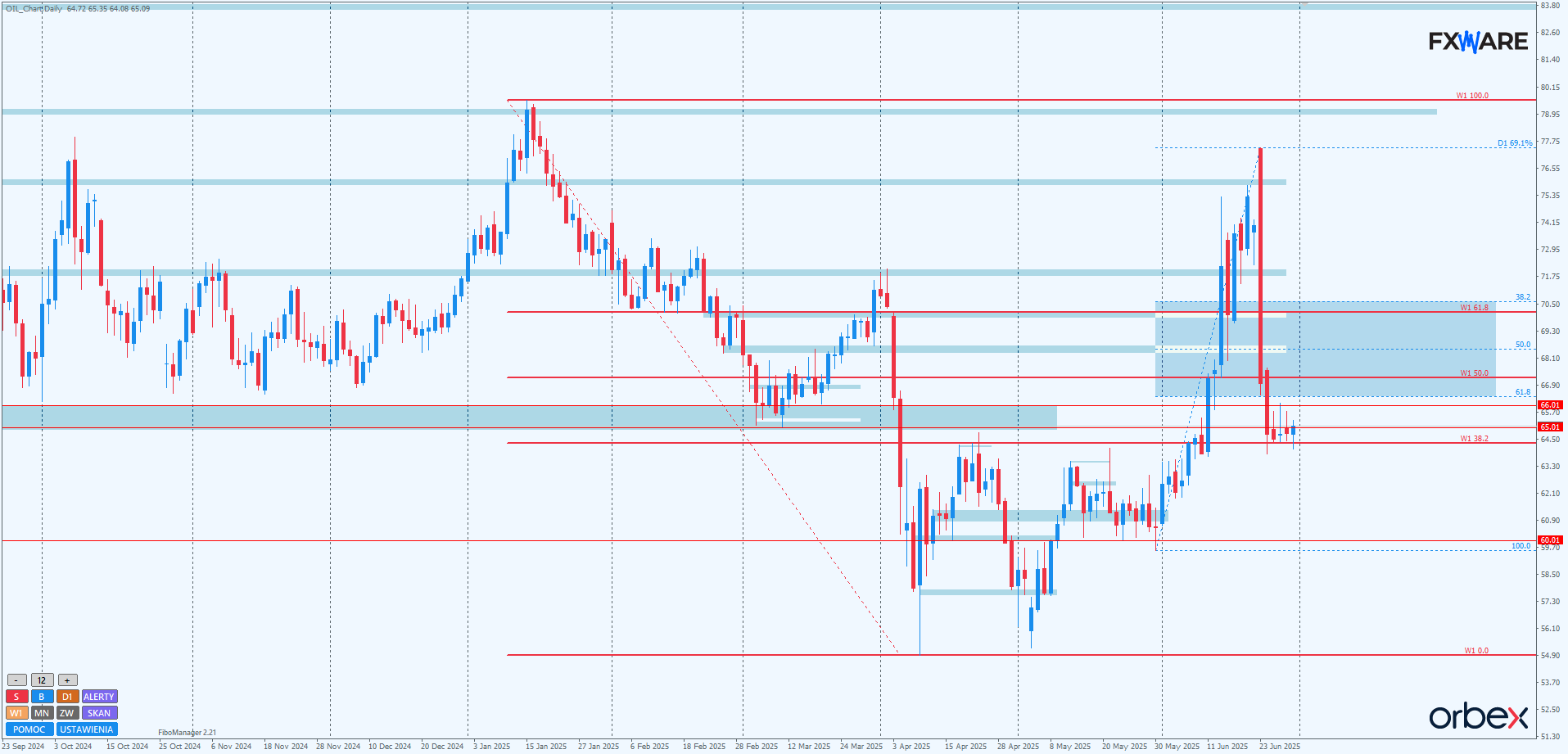 Ubiegły tydzień to na ropie WTI całkowita zmiana nastrojów o 180 stopni względem poprzedniego tygodnia. Obawa przed blokadą Cieśniny Ormuz, przez którą przepływa 20% dziennego wydobycia ropy, wywindowała wycenę czarnego złota do 78$ za baryłkę. Następnie wieści o zawieszeniu broni między Iranem a Izraelem zbiły cenę ponownie poniżej kluczowej strefy SR 65–66$. Od kilku dni cena konsoliduje lekko poniżej tego obszaru, zapuszczając się w niego tylko knotami. Wszelkie zamknięcia dzienne jak na razie odbywały się poniżej. Natomiast poziom 64.4$, czyli dawny przebity poziom Fibo 38.2, wyraźnie ogranicza wszelkie ruchy niedźwiedzi. Dopiero opuszczenie tego rejonu z nakreślonymi wyżej granicami da odpowiedź na pytanie, czy ostatni impuls niedźwiedzi doczeka się korekty, czy będziemy mieli do czynienia z nowym impulsem podaży, potencjalnie z zasięgiem nawet w kierunku 60$ za baryłkę.