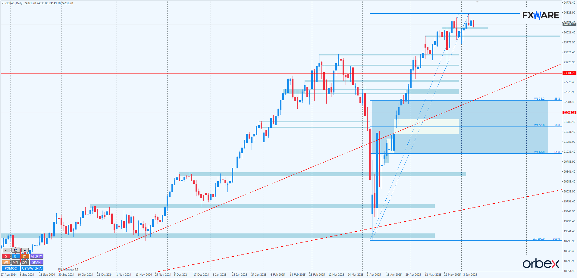 Na wykresie dziennym DAX po ustanowieniu ATH w czwartek wydaje się rysować swing w dół. Czwartkowa świeca dzienna w formie pro spadkowego pinbara jak na razie spowodowała tyle, że piątkowa odpowiedź byków była na mizernym momentum. Dziś w tej sekwencji zostało już co prawda ustanowione nowe minimum, ale dopiero dzisiejsze zamknięcie dostarczy informacji o potencjale ruchu w dół. Od dwóch miesięcy trwa trend wzrostowy, więc wszelki rozpęd, jaki uda się niedźwiedziom uzyskać w początkowej fazie jego kompensowania, jest dla nich nie do przecenienia. W obecnej sytuacji najistotniejsze wydaje się uzyskanie jakiegokolwiek zamknięcia poniżej 24150. W przypadku dotarcia do RN 24000 nie będzie można jeszcze mówić o wyłamaniu struktury. Jednak wraz z pinbarem z 5 maja ułożyłoby się to w obraz silnej odpowiedzi podaży. Z podobną mieliśmy co prawda do czynienia dwa razy pod koniec maja, jednak finalnie nie przyniosły one wyłamania struktury wzrostowej.