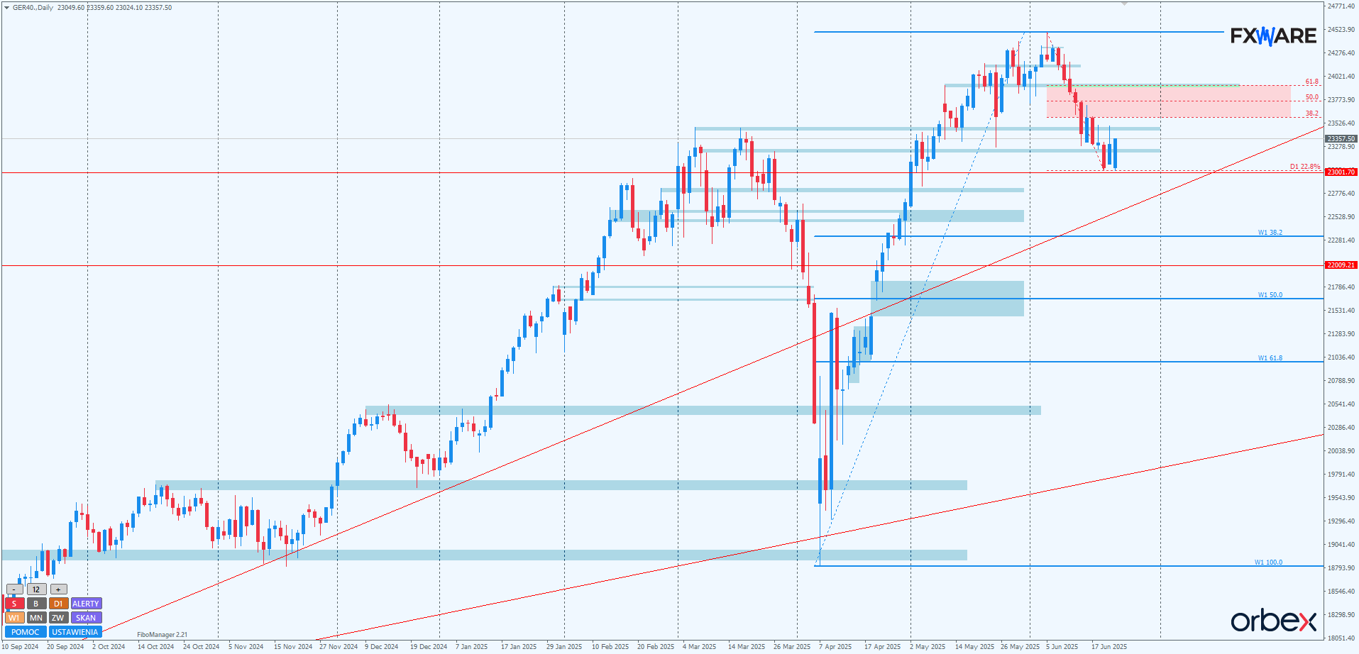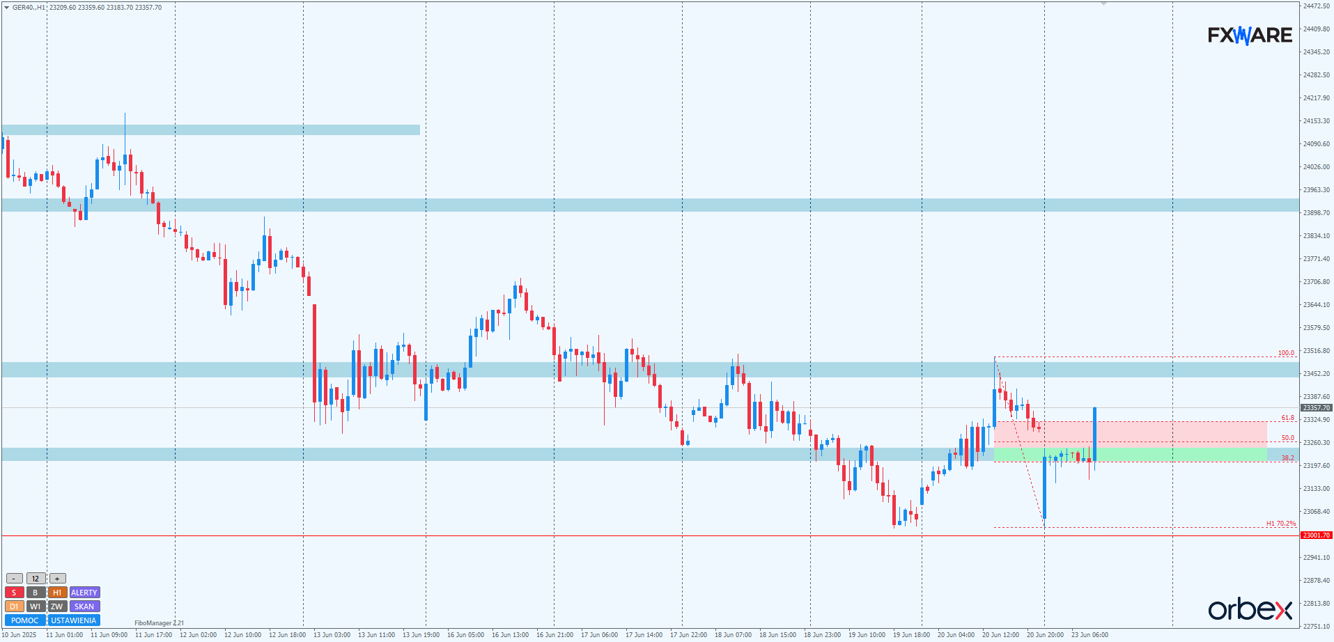 Na wykresie dziennym DAX rozpoczął notowania od prospadkowej luki z otwarciem niedaleko psychologicznego RN 23000. W ciągu kilku godzin zakres luki został wybrany i rozpoczęły się zmagania z okolicami 23300, gdzie znajdują się czubki prowzrostowych knotów z maja i szczyty wyznaczające double top z marca. Rejon ten od zeszłego tygodnia, zgodnie z ZZB, działa jako opór. Dzisiejsze zamknięcie – jeśli nastąpi powyżej 23300 i domknie obszar luki – może przynieść wzrosty w kierunku strefy zniesień Fibo. Niższe zamknięcie, nie engulfujące body piątkowej D1, potwierdzi aktualną sekwencję od 5 czerwca i uprawdopodobni kolejny atak na RN 23000.
