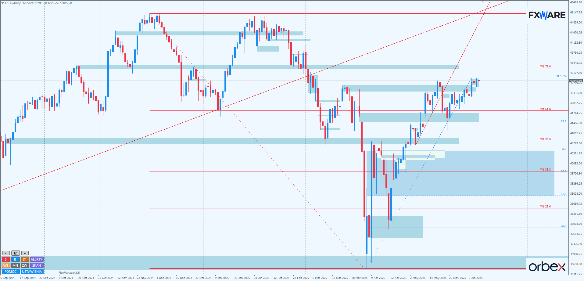 Warto obserwować w tym kontekście formę zamknięć dziennych, gdyby bykom udało się dotrzeć do SR na RN 43300. Wszelkie pinbary sięgające knotami tego poziomu, engulfy, outsidebary będą świadczyć o korekcie. Pokonanie natomiast 43300 świecami z dużym body lub wręcz marubozu na dużym momentum ukonstytuuje 42700 jako solidne wsparcie na dłuższy czas, być może nawet na wiele tygodni.