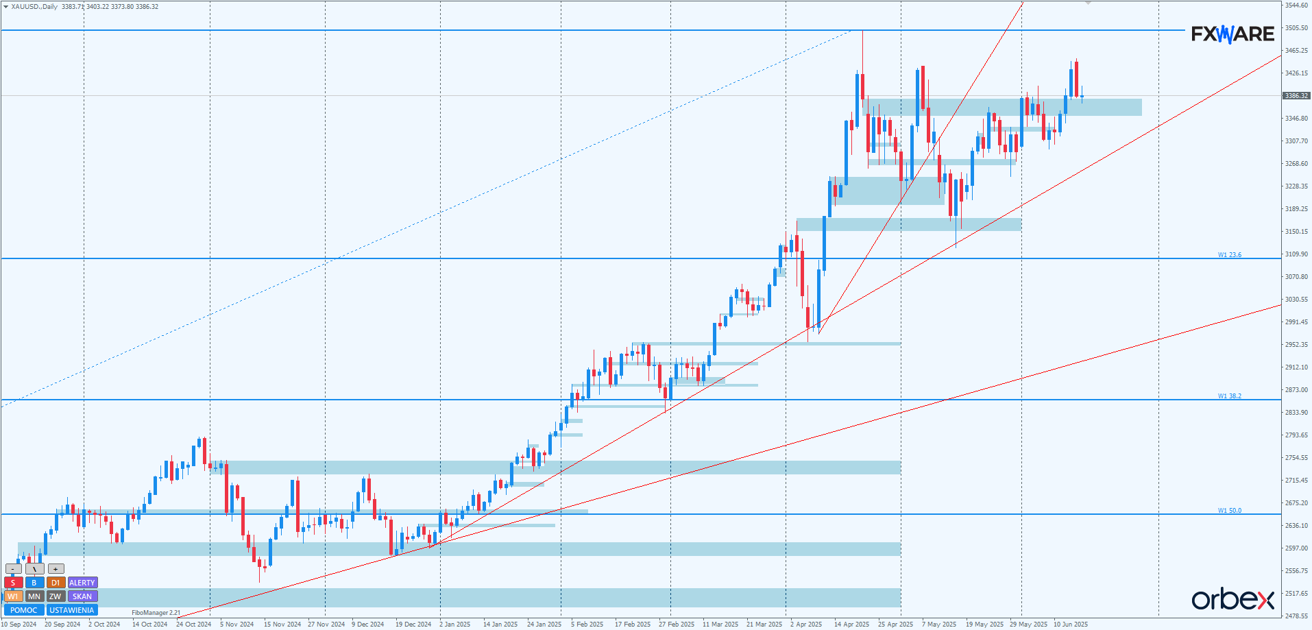 Poziomy zniesień Fibonacciego, zostały automatycznie naniesione za pomocą wskaźnika FiboManager. Jest on także dostępny gratis dla traderów Orbex. Warunkiem jest posiadania aktywnego konta.