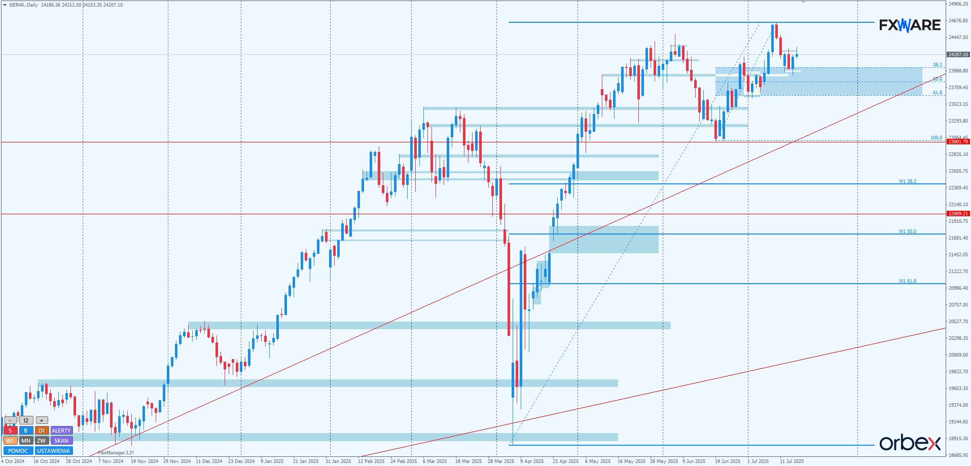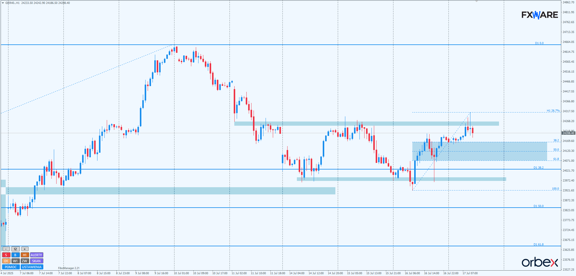 Na wykresie dziennym DAX wczoraj drugi raz zmagał się z rejonem pomiędzy 38,2 a pivotem strefy zniesień swingu mierzonego od czerwcowych minimów. Ze starcia zwycięsko wyszły byki. Zamknięcie nie engulfowało co prawda body świecy z wczoraj, ale ruch w górę był na tyle znaczący, że czuć ochotę popytu do rysowania swingu w stronę ATH. Sporo zależeć będzie od dzisiejszego zamknięcia. Kształt i rozmiar dzisiejszej świecy daily pozwoli określić szanse na to, że bykom udało się rozpocząć impuls od strefy zniesień w górę. Do tego wymagane byłoby zamknięcie dość wysokie, najlepiej powyżej 24300. Niższe zamknięcia poniżej 24200 mogą spowodować kilkusesyjną konsolidację lub nawet próbę przeciśnięcia się niedźwiedzi przez wspomnianą strefę na małym rozpędzie.