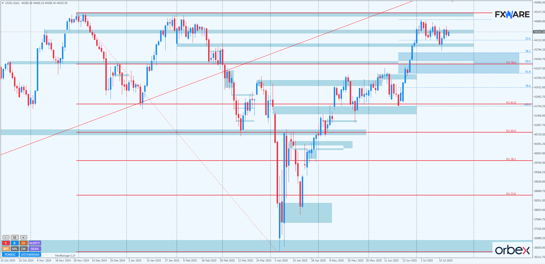 Dow Jones na wykresie dziennym pozostaje w formacji flagi opadającej w stronę strefy zniesień fibo swingu mierzonego od czerwcowych minimów. Pomimo próby wyprowadzenia rozstrzygającego swingu przez byki, piątek okazał się dniem rozczarowania dla nich. Nie wszystko jeszcze stracone i wciąż mogą zamknąć dzień formacją engulfującą piątkową świecę dzienną, jednak w obecnej sytuacji wszelkie niepowodzenie czy nawet zawahania mogą doprowadzić do utworzenia się spadkowego momentum i przedłużenia korekty – tym razem zapewne już w strefie zniesień fibo. Cała 4-miesięczna sekwencja nie jest zagrożona i nawet korekta w okolice round numberu 43000, o ile trwałaby co najmniej kilka dni, zagrożeniem dla ogólnego trendu by nie była.