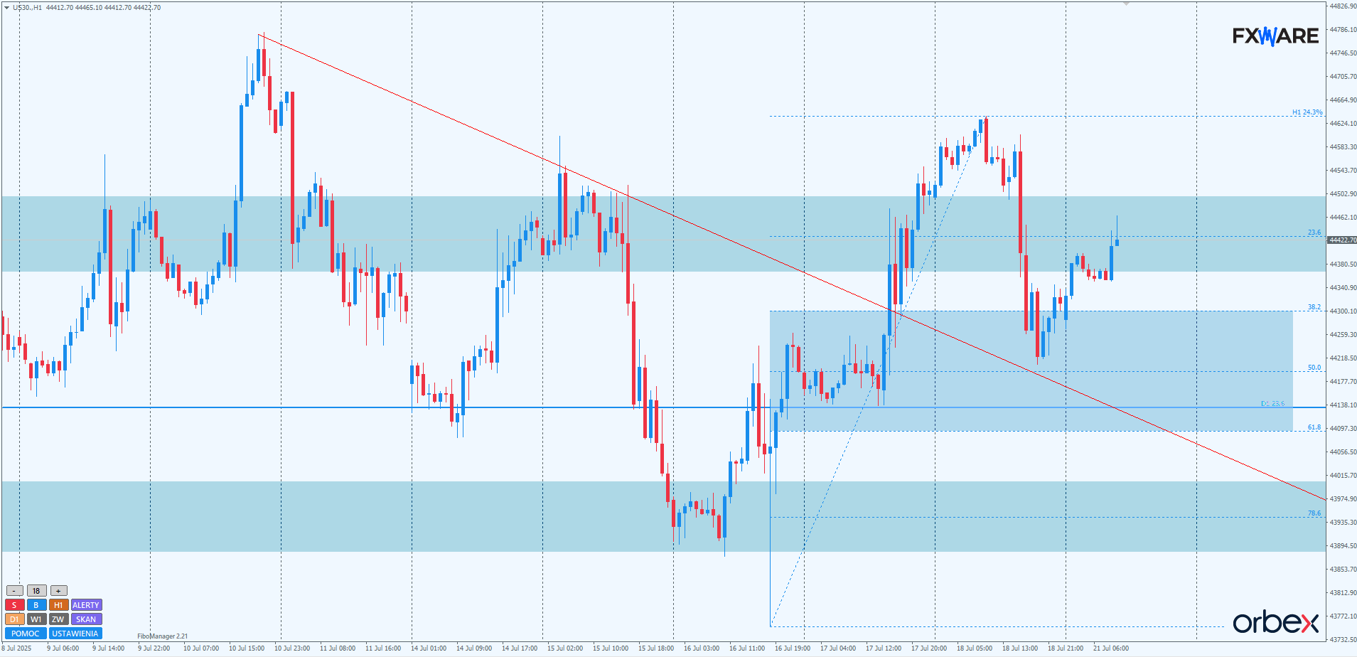 Na wykresie H1 w czwartek nastąpiło wyłamanie na sporym momentum lokalnej struktury spadkowej. To ten ruch przyniósł nadzieję bykom na rysowanie kolejnego impulsu widocznego na wyższych TF. Odpowiedź podaży z piątku była jednak równie silna, jeśli chodzi o poziomy cenowe, a nawet silniejsza, jeśli wziąć pod uwagę momentum. Jak na razie doprowadziła do retestu tej lokalnej LT od góry, ale nie wykluczone, że znajdujemy się w kolejnej klasycznej strukturze podobnej do tej z zeszłego tygodnia. Tym bardziej, że momentum byków po reteście nie zachwyca. Trudno się zresztą temu dziwić – piątkowe mini tąpnięcie było dość mocne jak na warunki dnia. Cała sytuacja powinna się wyjaśnić najpóźniej w okolicach 44500–44600. To ostatnie sensowne miejsce dla podaży do ponowienia impulsu, jeśli chcą zachować klasyczną, faworyzującą ich inicjatywę strukturę. Zamknięcia powyżej tego rejonu będą z kolei sporym sukcesem byków w kategoriach PA i mogą zapoczątkować przyspieszenie na wyższych TF.