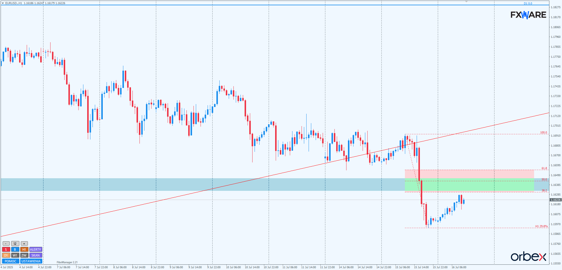 Na H1 miejsce załamania jest jeszcze lepiej widoczne. Trzy sesje hamowania i konsolidacji nie spowodowały mobilizacji byków. Do przełamania LT doszło na względnie słabym momentum. Równie niemrawo odbył się retest, który już później zainicjował pełnoskalowe tąpnięcie. Wytworzył się przy okazji obszar fair value gap, pokrywający się aktualnie ze strefą zniesień Fibo swingu mierzonego od wczorajszych maksimów. Gdyby cena w niego weszła, może to być szansa na szybsze odreagowanie dla byków, choć w obliczu aktualnego układu momentum i budowy wręcz klasycznej struktury niższych szczytów i dołków może to być dla popytu karkołomne, o ile nie niemożliwe zadanie.